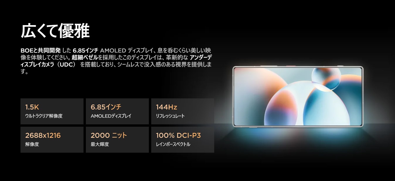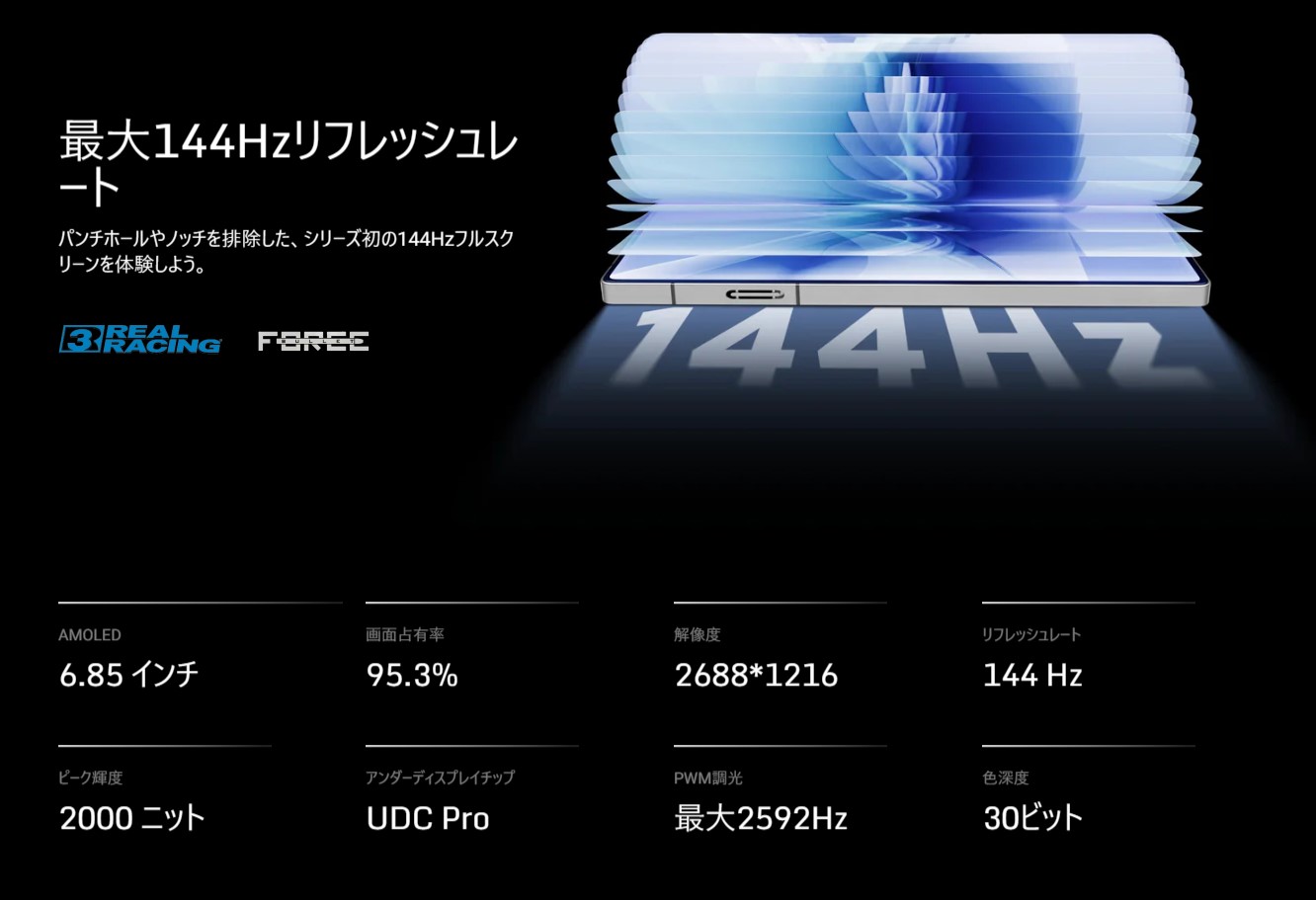 - ディスプレイ:6.85インチ(2688×1216・AMOLED・144Hz)