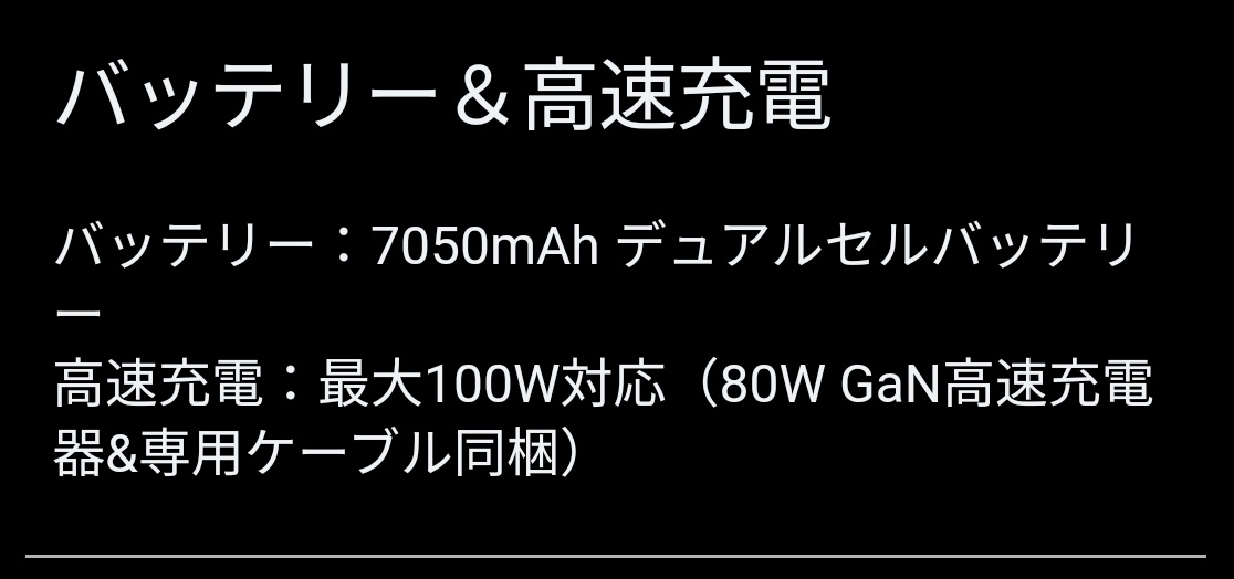 - バッテリー:7050mAh(最大100W充電、80W Gan高速充電機&ケーブル同梱)