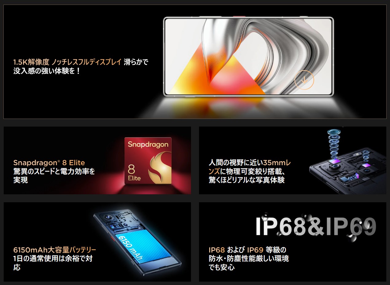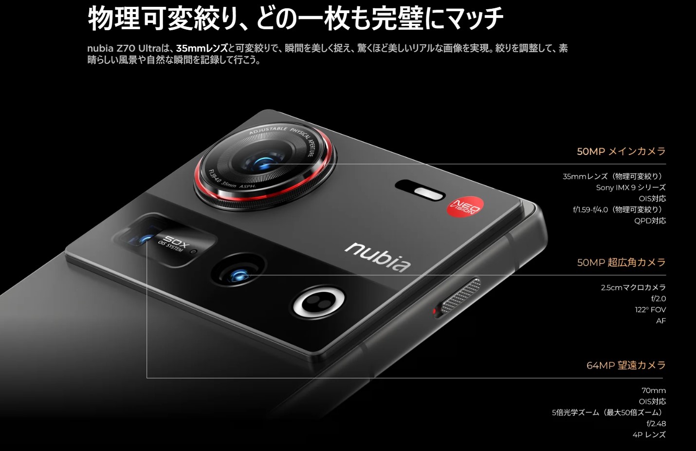 ZTEジャパンは、Snapdargon 8 Eliteや物理可変絞りのカメラを搭載したスマートフォン「nubia Z70 Ultra」、Snapdargon 8 EliteやUDC採用でフルスクリーンのゲーミングスマートフォン「RedMagic 10 Pro」、縦折りの折りたたみスマートフォン「nubia Flip 2」、UNISOC T760搭載の11インチタブレット「nubia Pad SE」を発表しました。