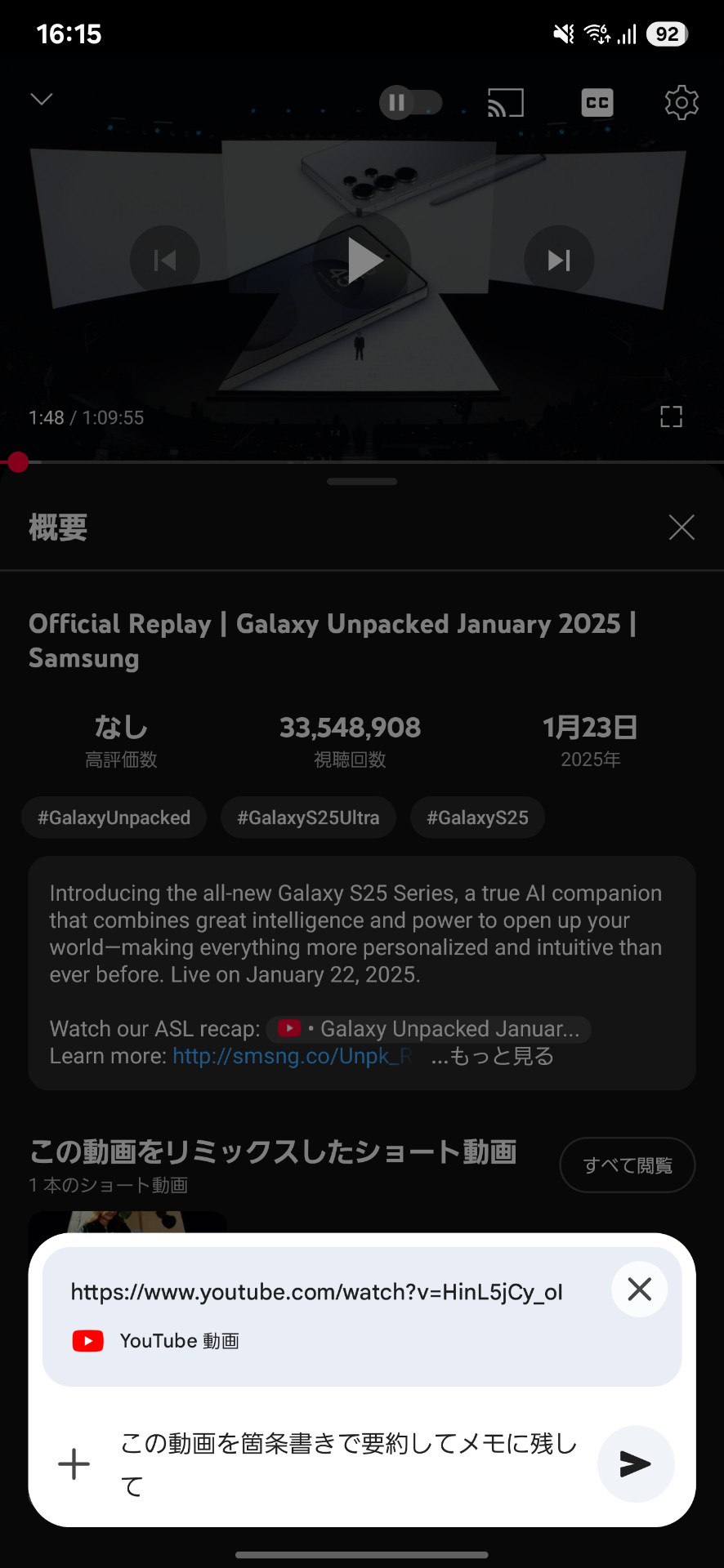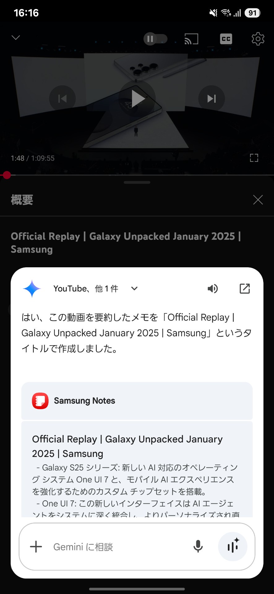 YouTube動画中にGemini起動してこの動画について質問を押した後に「この動画を要約してメモに残して」