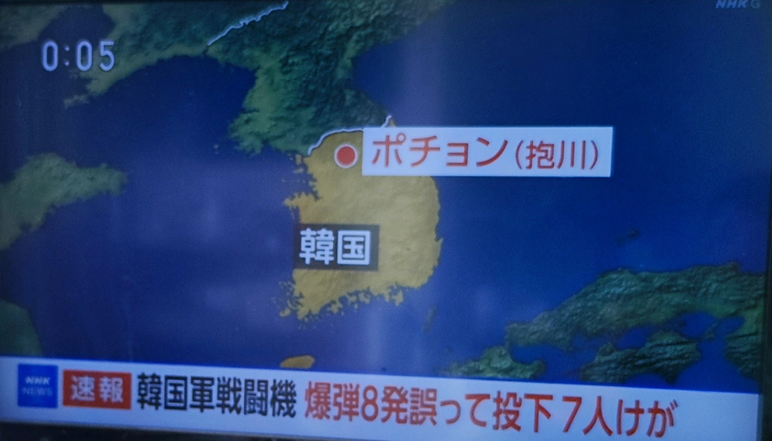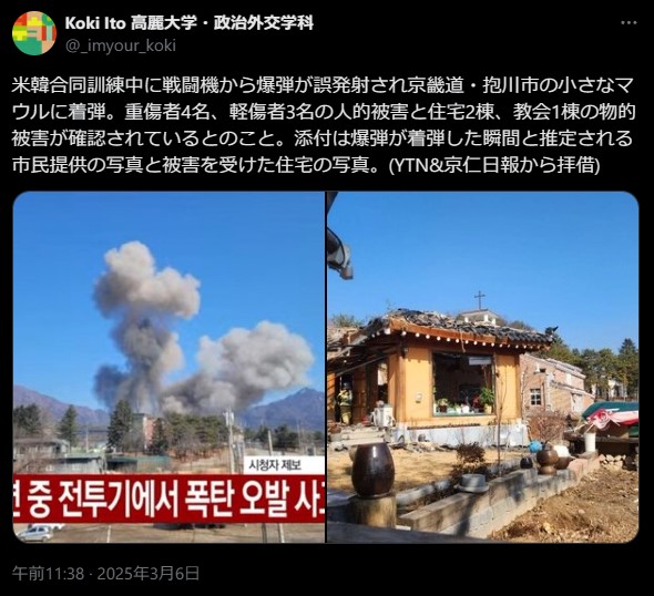 米韓合同訓練中に戦闘機から爆弾が誤発射され京畿道・抱川市の小さなマウルに着弾。重傷者4名、軽傷者3名の人的被害と住宅2棟、教会1棟の物的被害が確認されているとのこと。添付は爆弾が着弾した瞬間と推定される市民提供の写真と被害を受けた住宅の写真。(YTN&京仁日報から拝借)