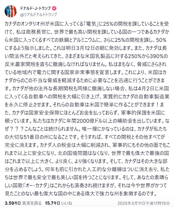 トランプ:商務長官に、カナダから米国に輸入されるすべての鉄鋼とアルミニウムに25%の追加関税を課し、50%にするよう指示した。