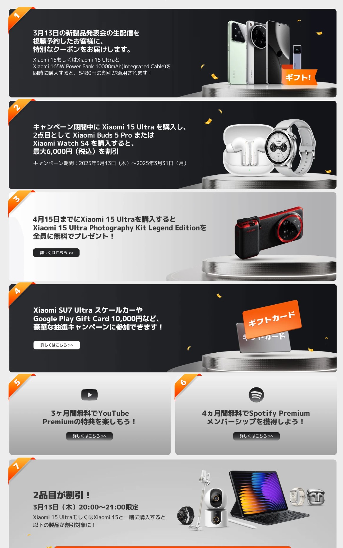 - 特典:Xiaomi Buds 5 Pro・Xiaomi Watch S4の3000円クーポンをプレゼント、Xiaomi 15 Ultra Photography Kit プレゼントは数量限定