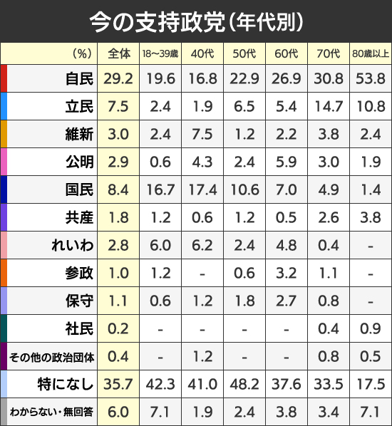 立憲民主党は13%、れいわ新選組と日本維新の会は5%、公明党と共産党は2%だった。「わからない」の回答も38%