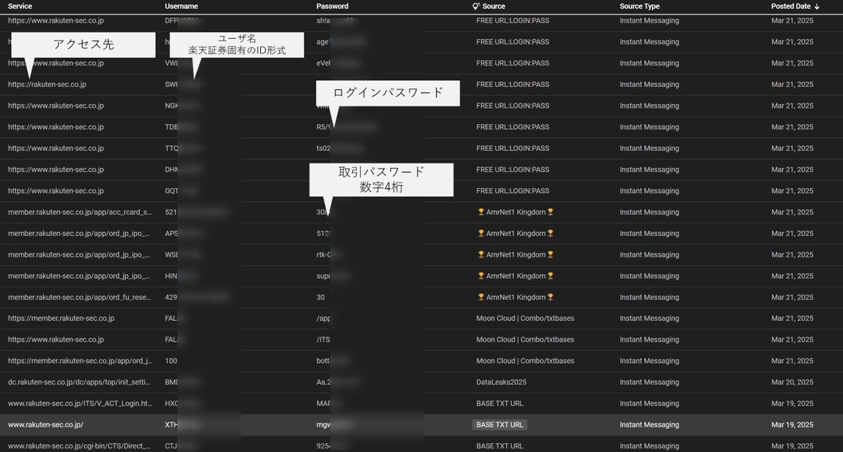 InfoStelaler経由で漏洩しダークウェブ上で販売・流通しているデータを調査すると、実際に楽天証券固有の形式のログイン用ID、Passwordと取引用Password(4文字数字)の漏洩が大量に確認できます。この情報があれば不正取引が可能です。以下画像はサンプルですが数万件の漏洩データがあります。