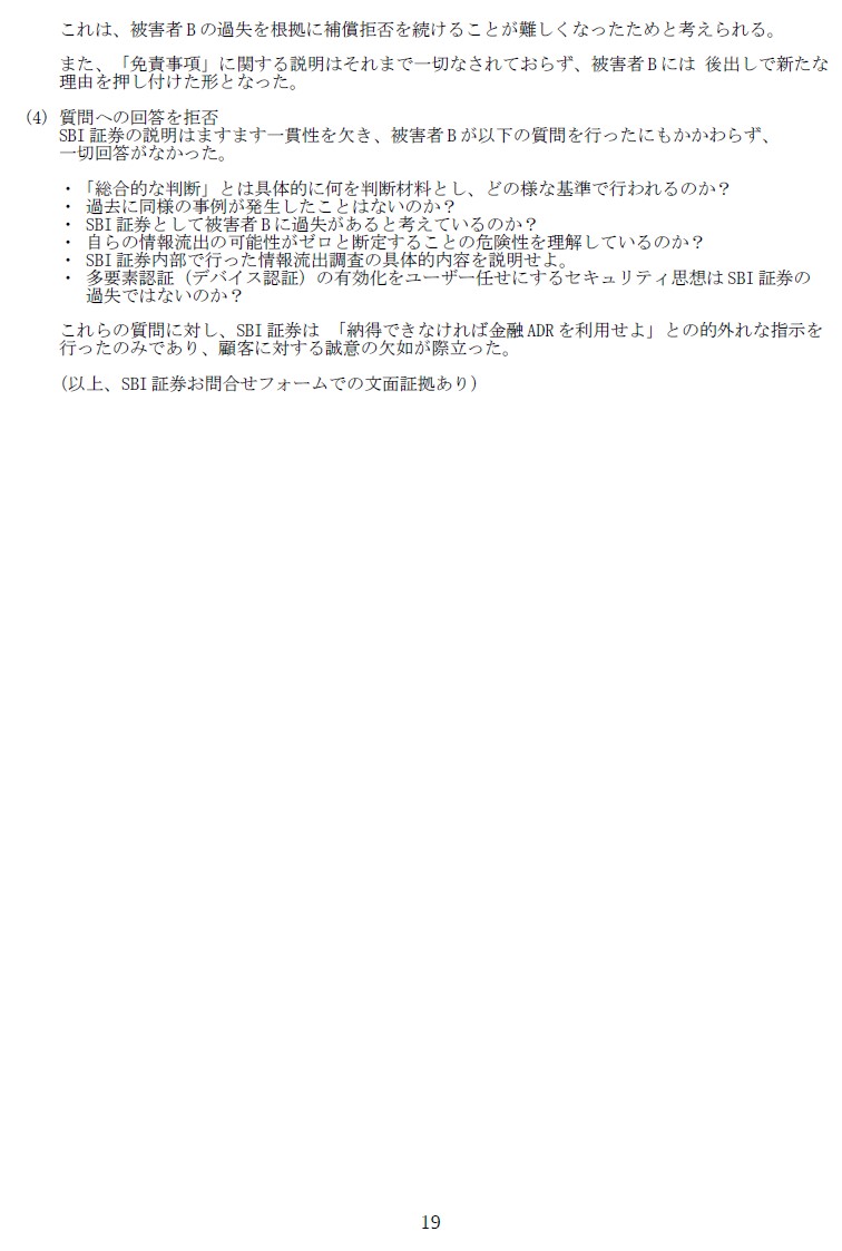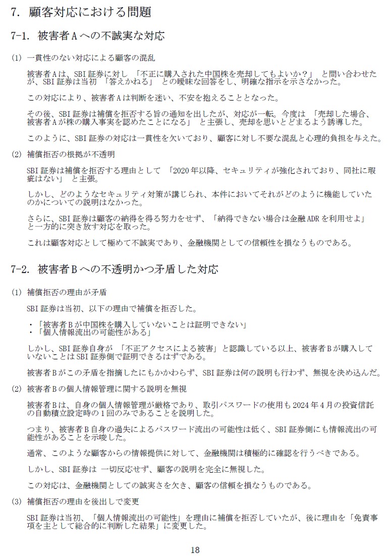 1枚目は今回の経緯をまとめたもので、文中の被害者Bが私です。 2〜3枚目の「顧客対応における問題」は、2月末頃までのSBIの対応を要約したものです。今となってはSBIならばまあ当然かなとしか思いませんが、当時は「こんな酷い企業があるのか!?」とセンセーショナルなインパクトを受けたものです。