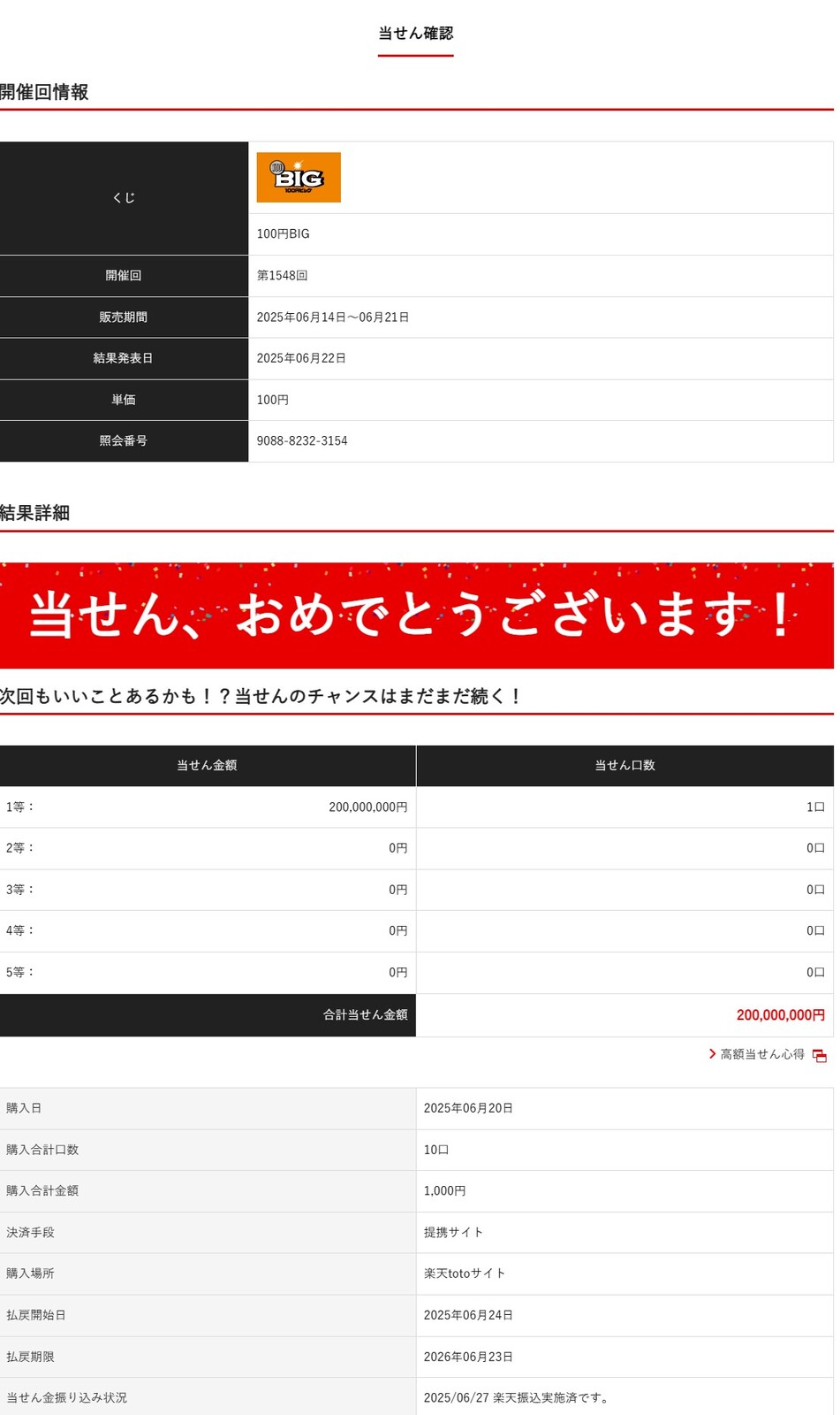 big系は何口買っても当選しないだろという思いが強く、毎回一口だけ購入も悪くない気がします