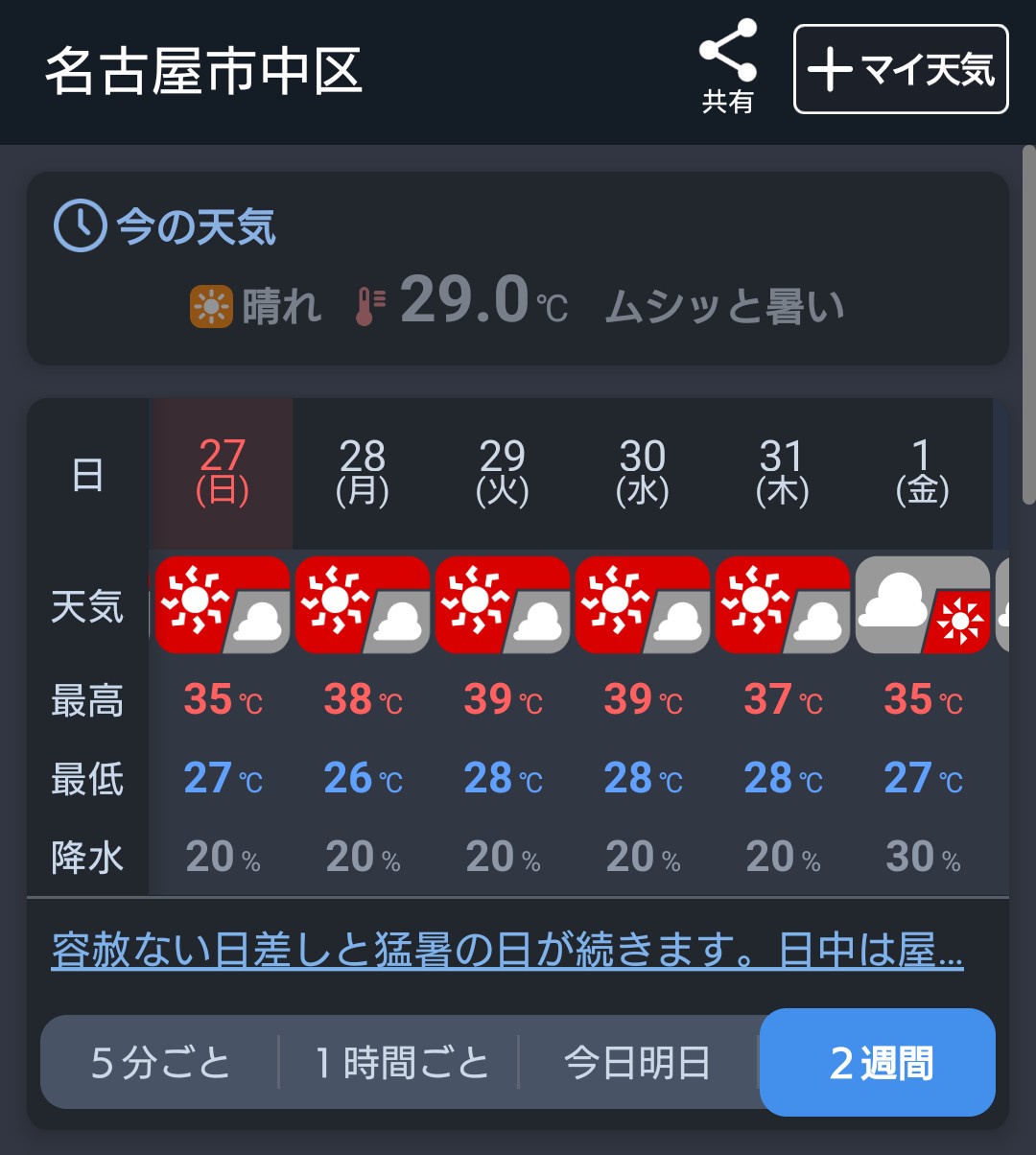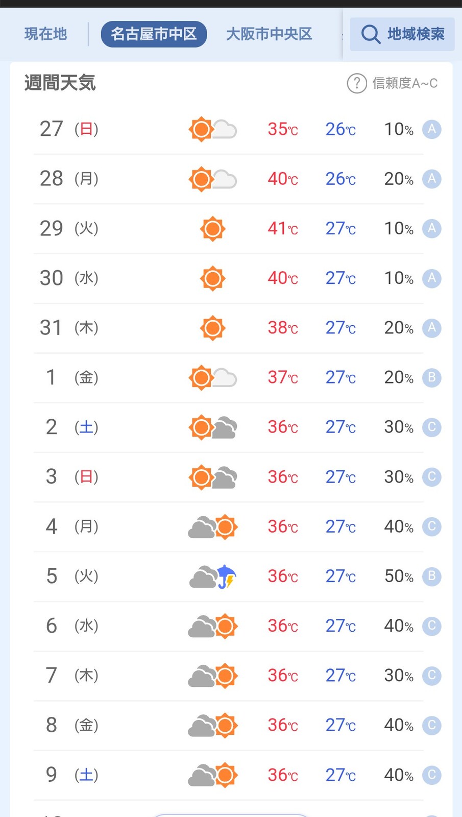 大阪は最近35℃予想詐欺で前日に33℃以下に変えられてそんなに暑くなってないからいきなり40℃のところ行くのは辛い