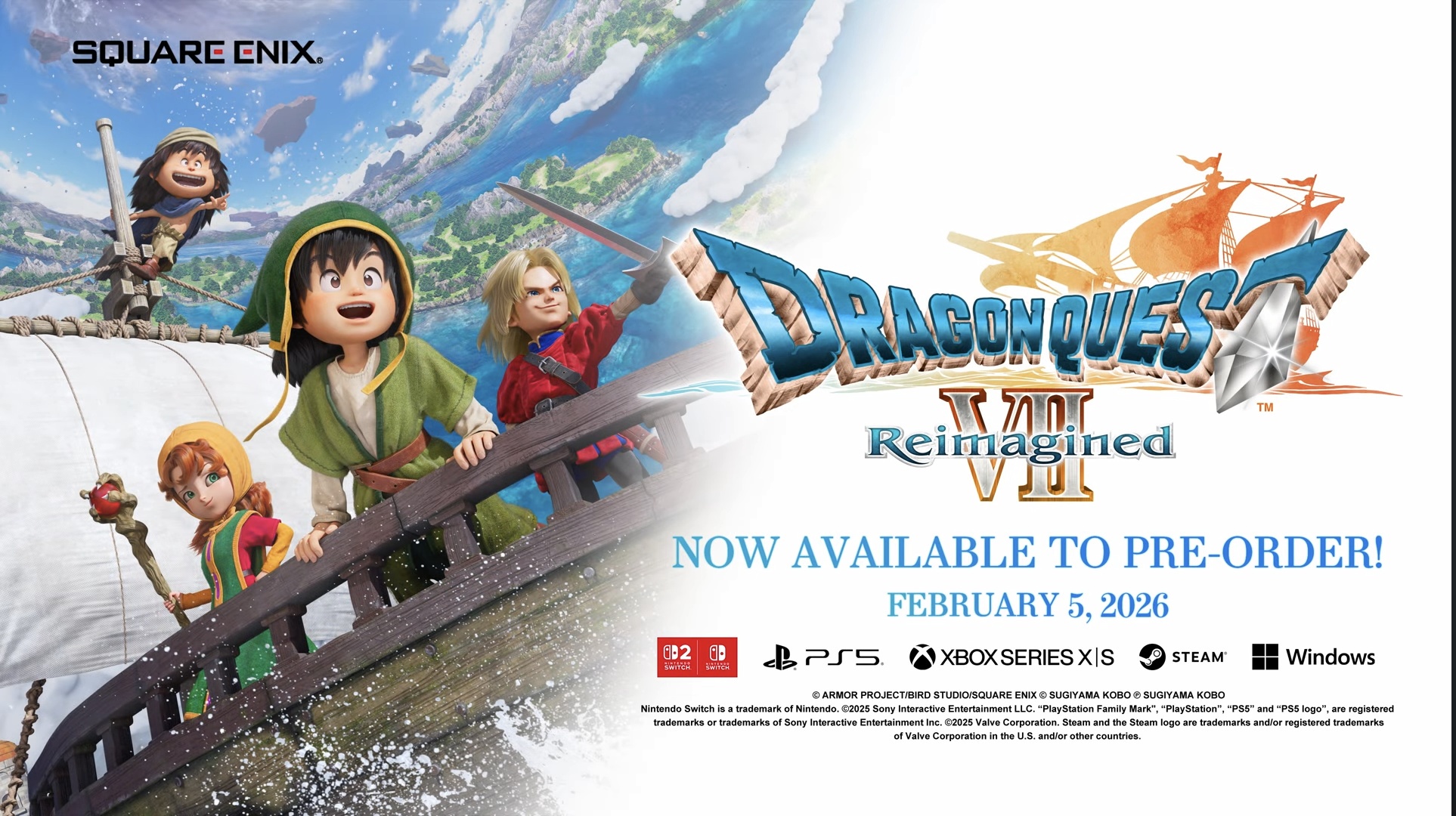 Square Enix has announced Dragon Quest VII Reimagined for PlayStation 5, Xbox Series, Switch 2, Switch, and PC (Steam, Microsoft Store). It will launch on February 5, 2026.