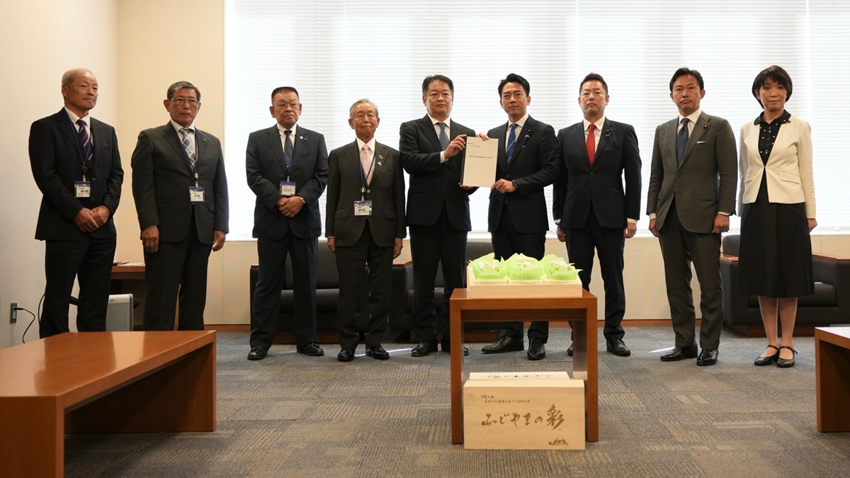 知事がJA山梨中央会の小池会長らとともに、小泉進次郎農林水産大臣に要請書提出。シャインマスカットの海外での生産許可(ライセンス展開)に「到底容認できない」と強い懸念を示し、農林水産省に対し、国内産地が国際市場で正当に競い合える環境整備を強く求めました。