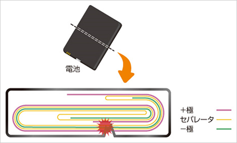 ・劣化…過充電や過放電でリチウムが析出し絶縁膜を突き破ってショートして発火
