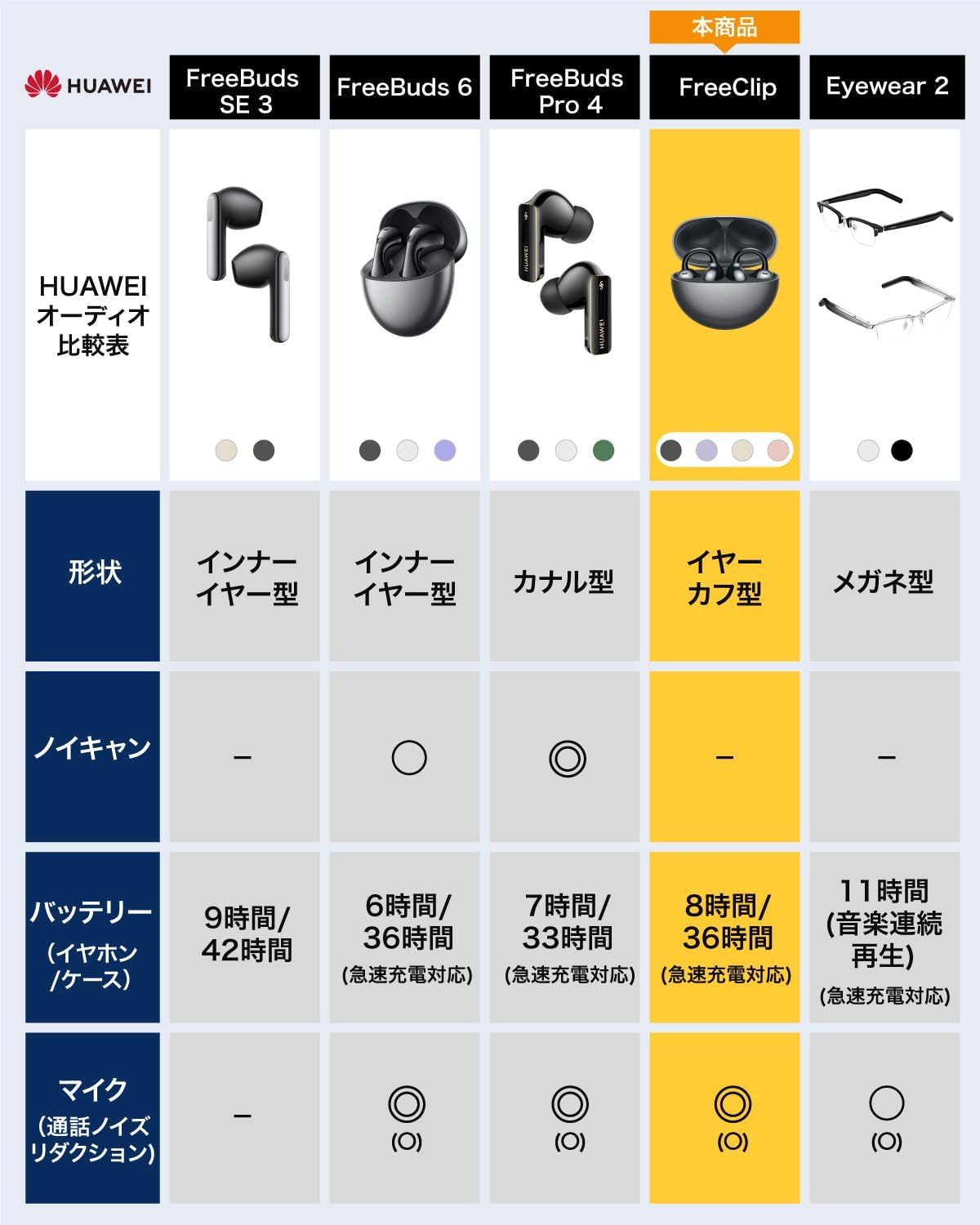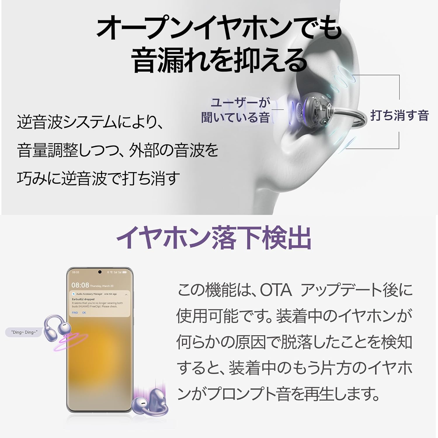 HUAWEI FreeClip ワイヤレスイヤホン Bluetooth オープンイヤー イヤーカフ型 3段階音量調整 耳を塞がないイヤホン 軽量約5.6g(本体) 音漏れ防止 マイク付き 通話ノイズリダクション 36時間再生 左右自動認識 IP54防塵防滴 ワイヤレス/急速充電 マルチポイント接続 パープル