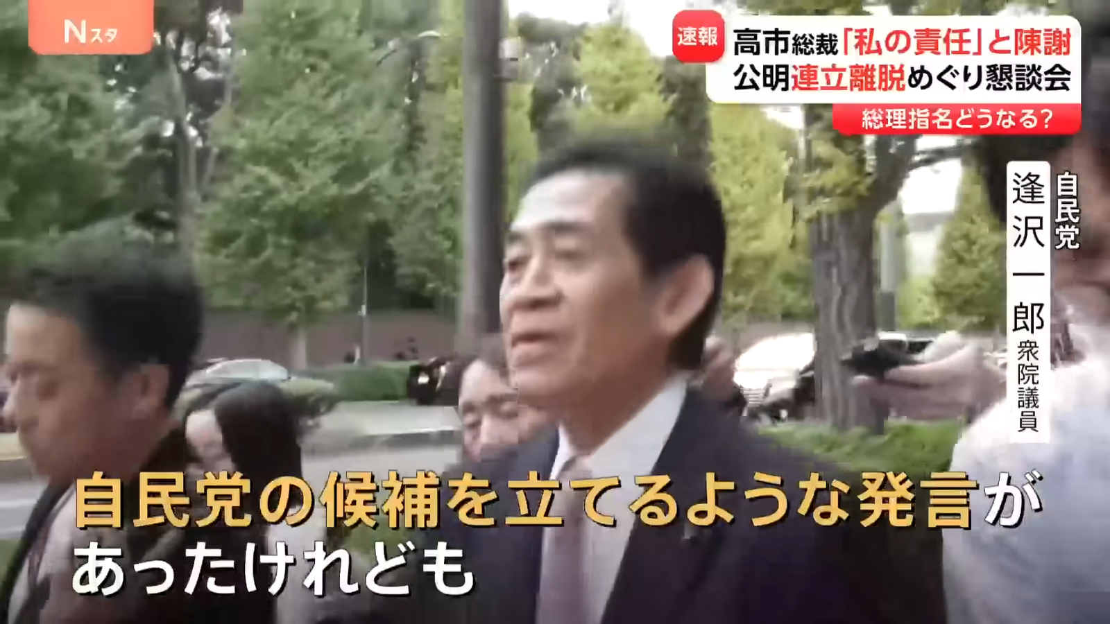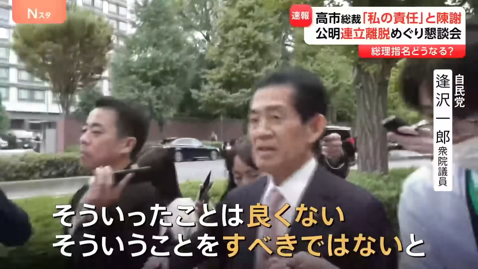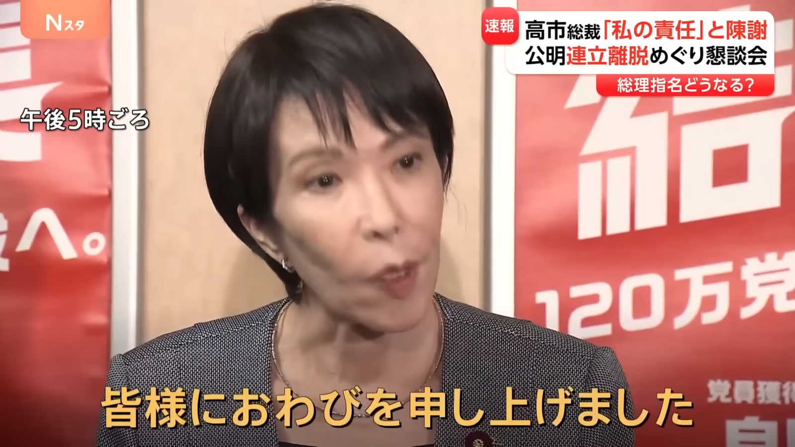 自民党の高市早苗総裁は14日、公明党の連立政権離脱を巡り、党両院議員懇談会で「私の責任だ。おわび申し上げる」と陳謝した。終了後、高市氏が記者団に明らかにした。