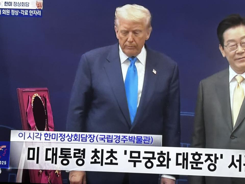 President Lee Jae Myung gifts @POTUS a Cheonmachong gold crown on his visit to South Korea 🇺🇸🇰🇷 pic.twitter.com/bxyMibIhGJ