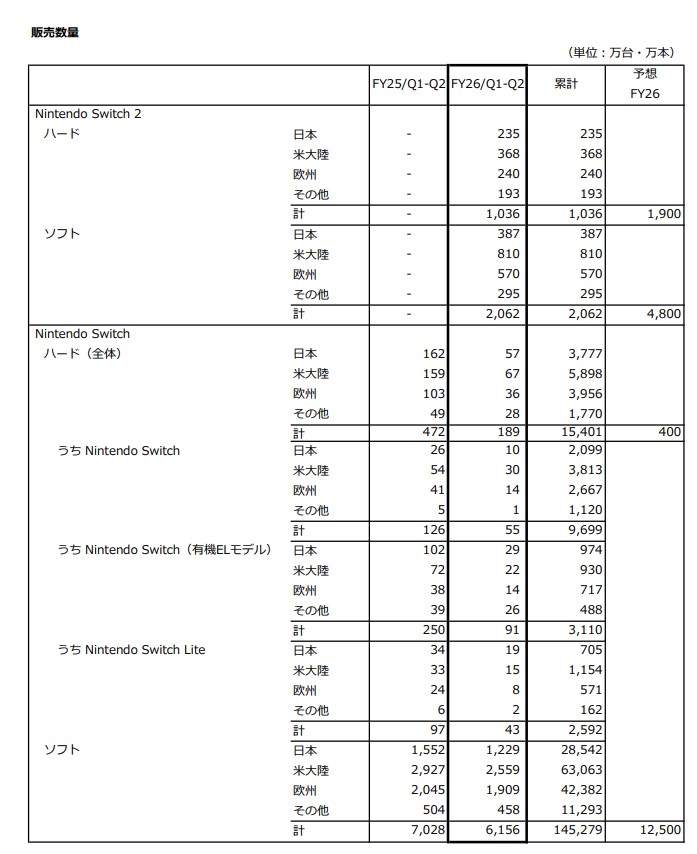 >また、Nintendo Switch ハードウェアは50万台減の400万台、ソフトウェアについては2,000万本増の1億2,500万本へと変更します。
