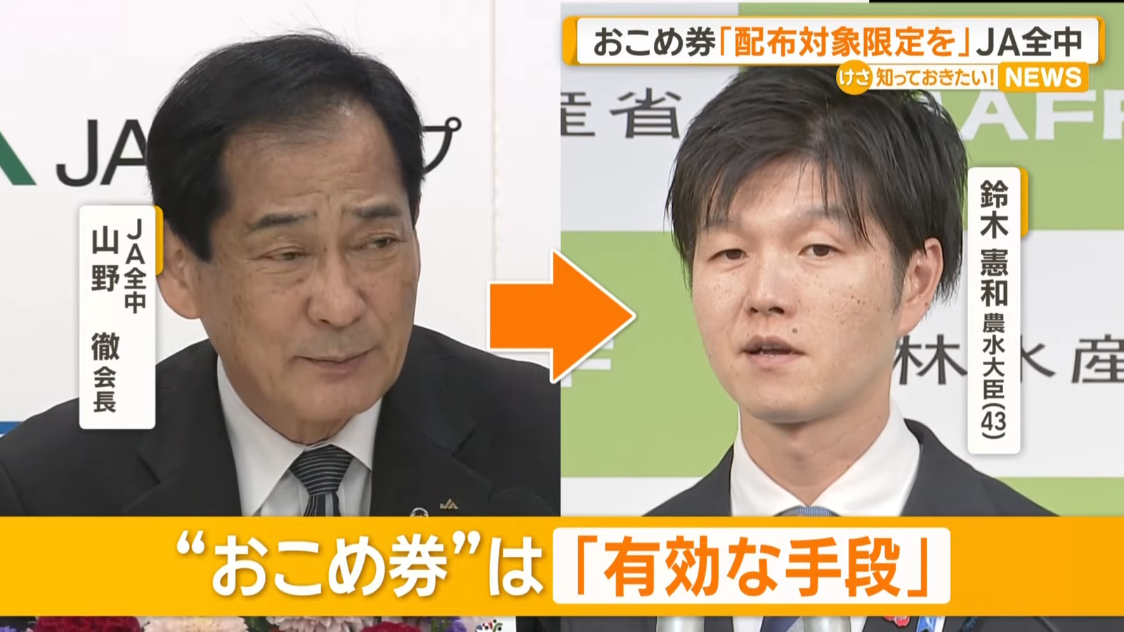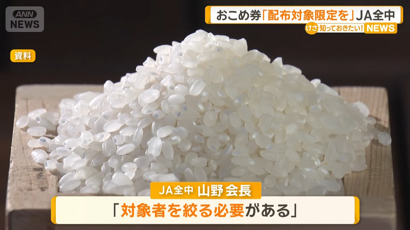 おこめ券配布は対象限定を JA全中会長、農水大臣案を「有効な手段」と評価