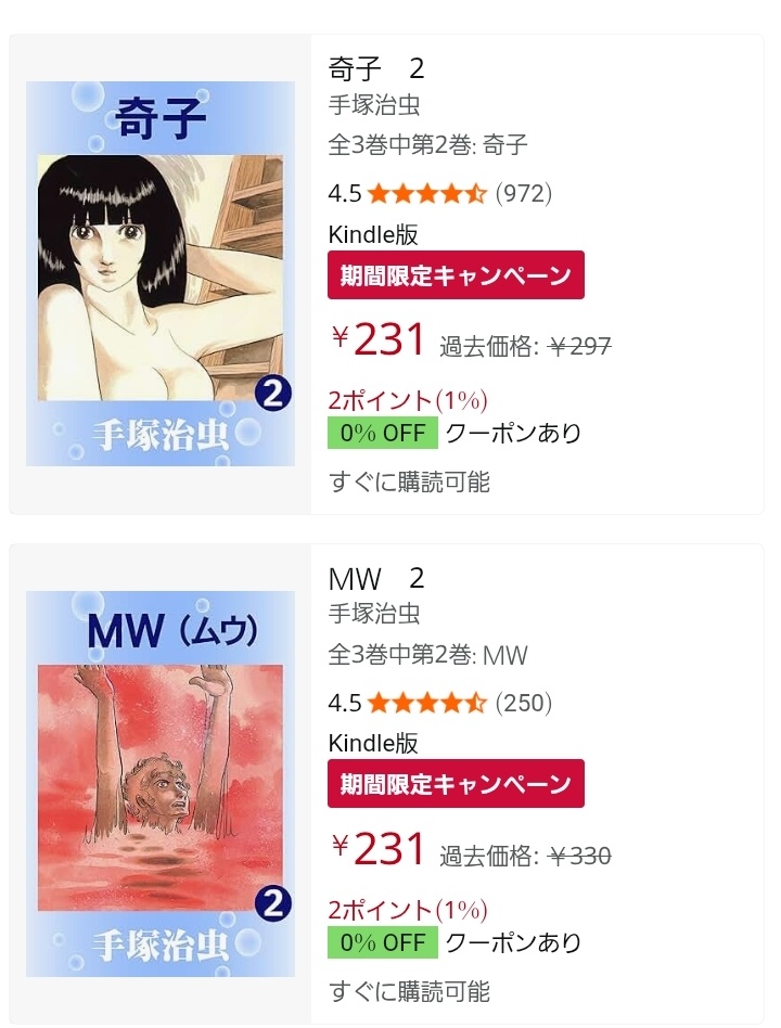 「【最大55%OFF】Kindle本 月替わりマンガ&ラノベセール」は、「火の鳥」や「アドルフに告ぐ」、「MW(ムウ)」、「ブッダ」、「どろろ」、「ブラックジャック」、「グリンゴ」、「ジャングル大帝」、「鉄腕アトム」、「ドン・ドラキュラ」、「タイのひとびと」、「 刀剣乱舞 ~日本号つれづれ酒~」など9000冊以上が対象です。欲しい本がある方はこの機会にぜひどうぞ。