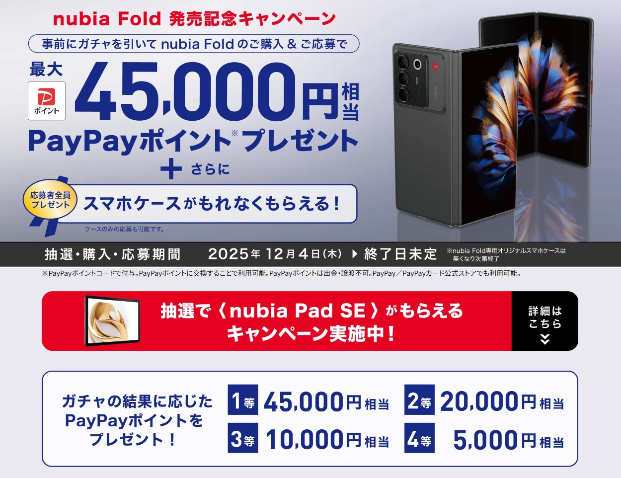 Y!mobileは12月4日、Snapdragon 8 Elite搭載の折りたたみスマートフォン「nubia Fold」、Dimensity 7400X搭載の縦折りスマートフォン「nubia Flip 3」を発表しました。