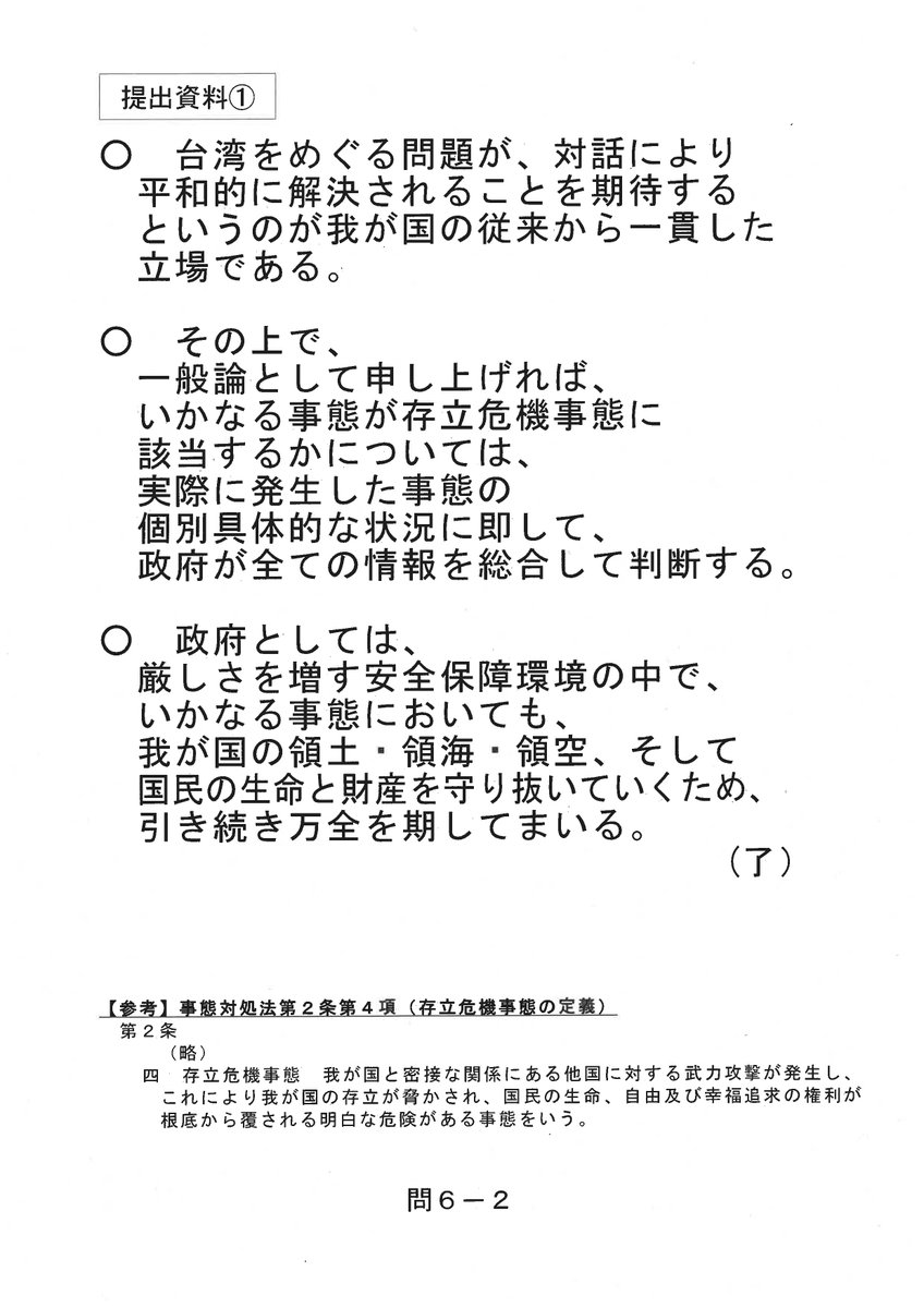 しかし、「問7 存立危機事態の認定可能性を軽々にいうのはいかがなものか」に対する答弁資料(台湾有事という仮定の質問には答えない)を高市総理は採用せず、いわゆる「台湾有事答弁」が出されたことがわかりました。