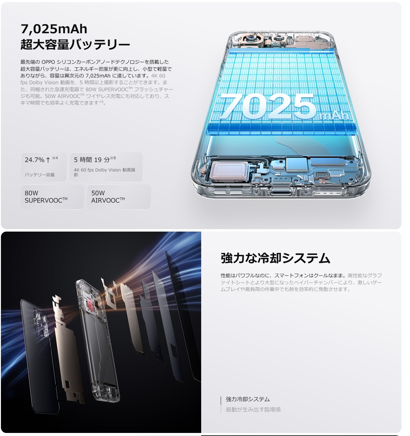 - バッテリー:7025mAh(80W SUPERVOOC、50W AIRVOOC)