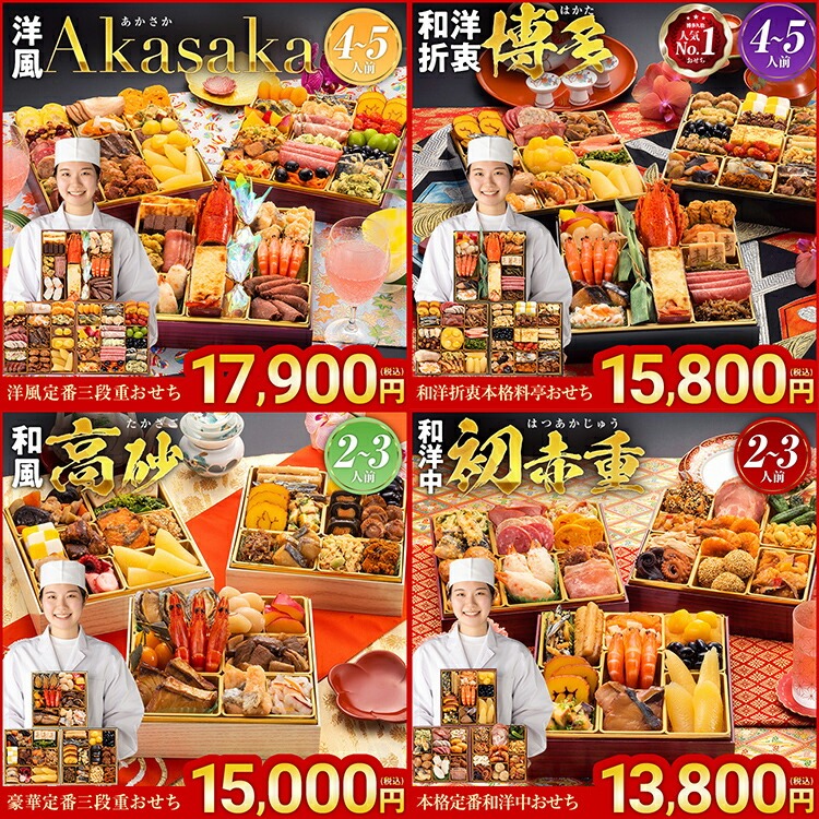 宝寿箱、高宮、千代、肉づくし重、西新、祝赤重、Akasaka、博多、高砂、初赤重