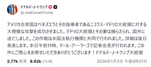 トランプ大統領、ベネズエラのマドゥロ大統領夫妻を拘束し除去したと投稿(´・ω・`)