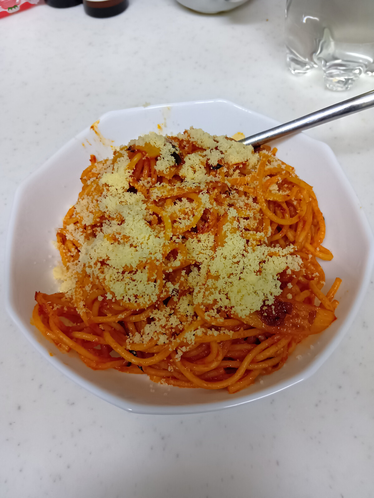 トマト2玉使ったからペペロンチーノじゃなくてアラビアータ風になったわ