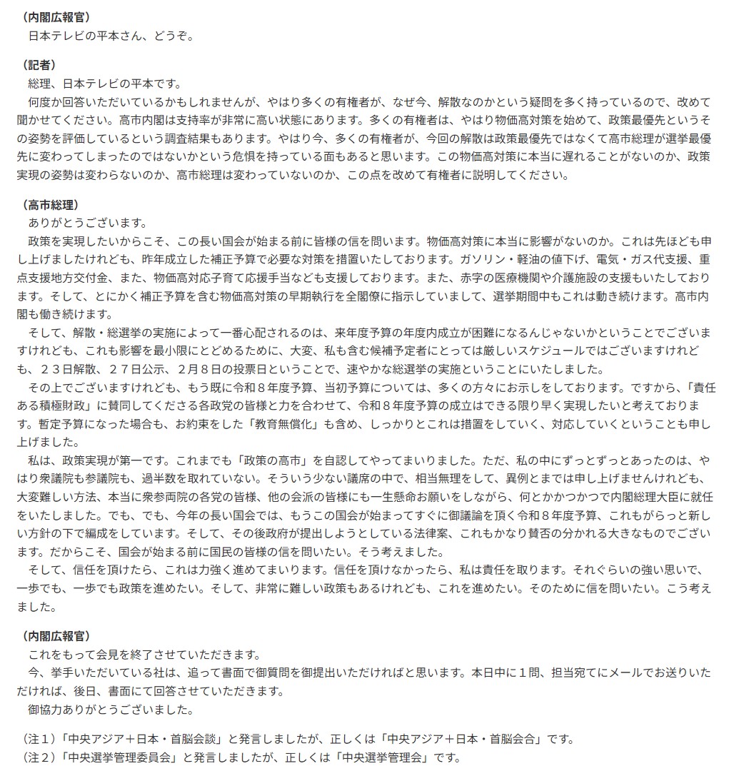 令和8年1月19日 高市内閣総理大臣記者会見 | 総理の演説・記者会見など | 首相官邸ホームページ