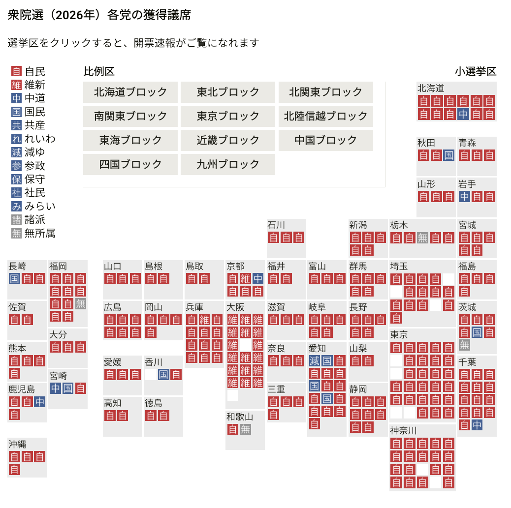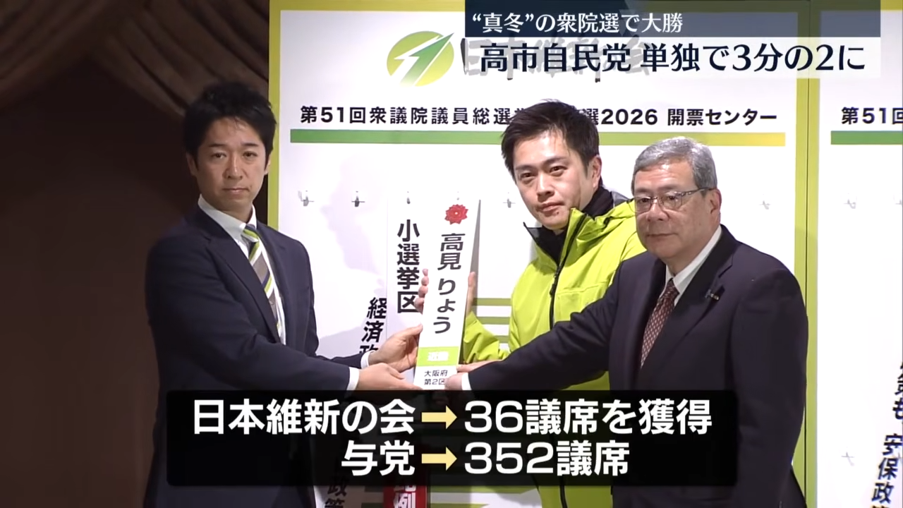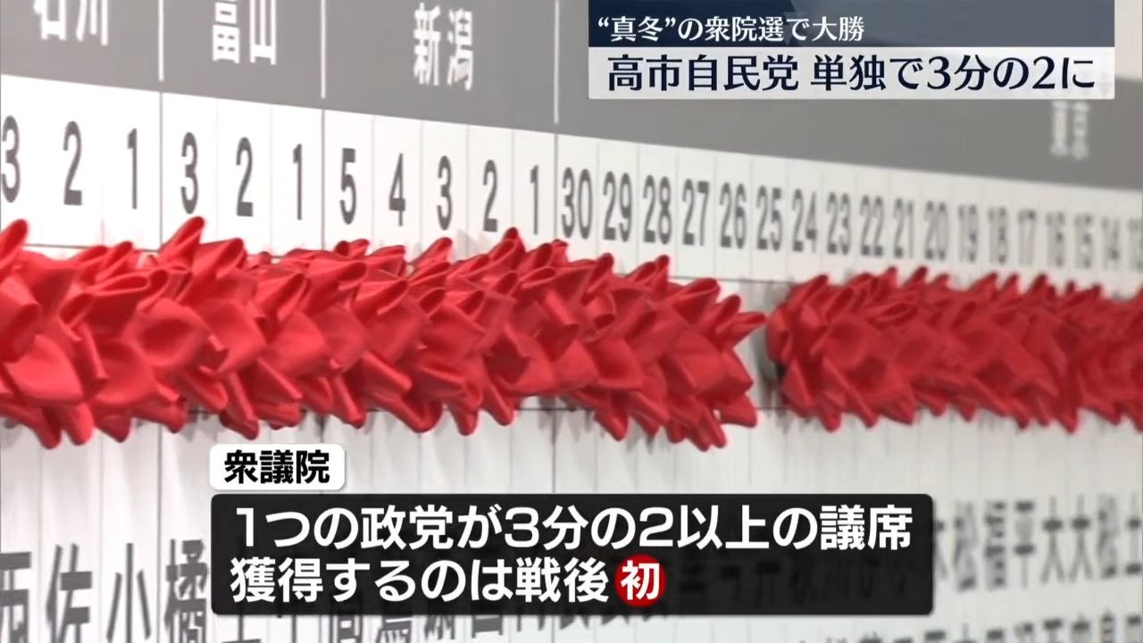自民が戦後最多316議席・中道49・維新36・国民28 衆院選の全議席確定