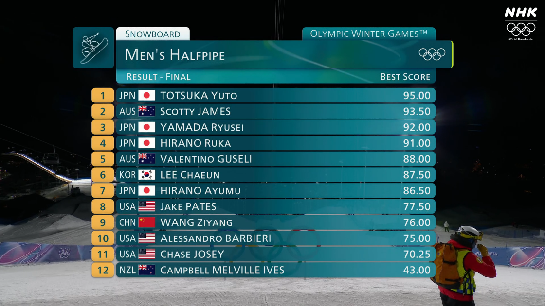 戸塚優斗が悲願の金メダル獲得!山田琉聖が銅メダル、平野流佳4位、前回覇者の平野歩夢は7位で連覇ならず【ミラノ・コルティナ五輪 男子ハーフパイプ】