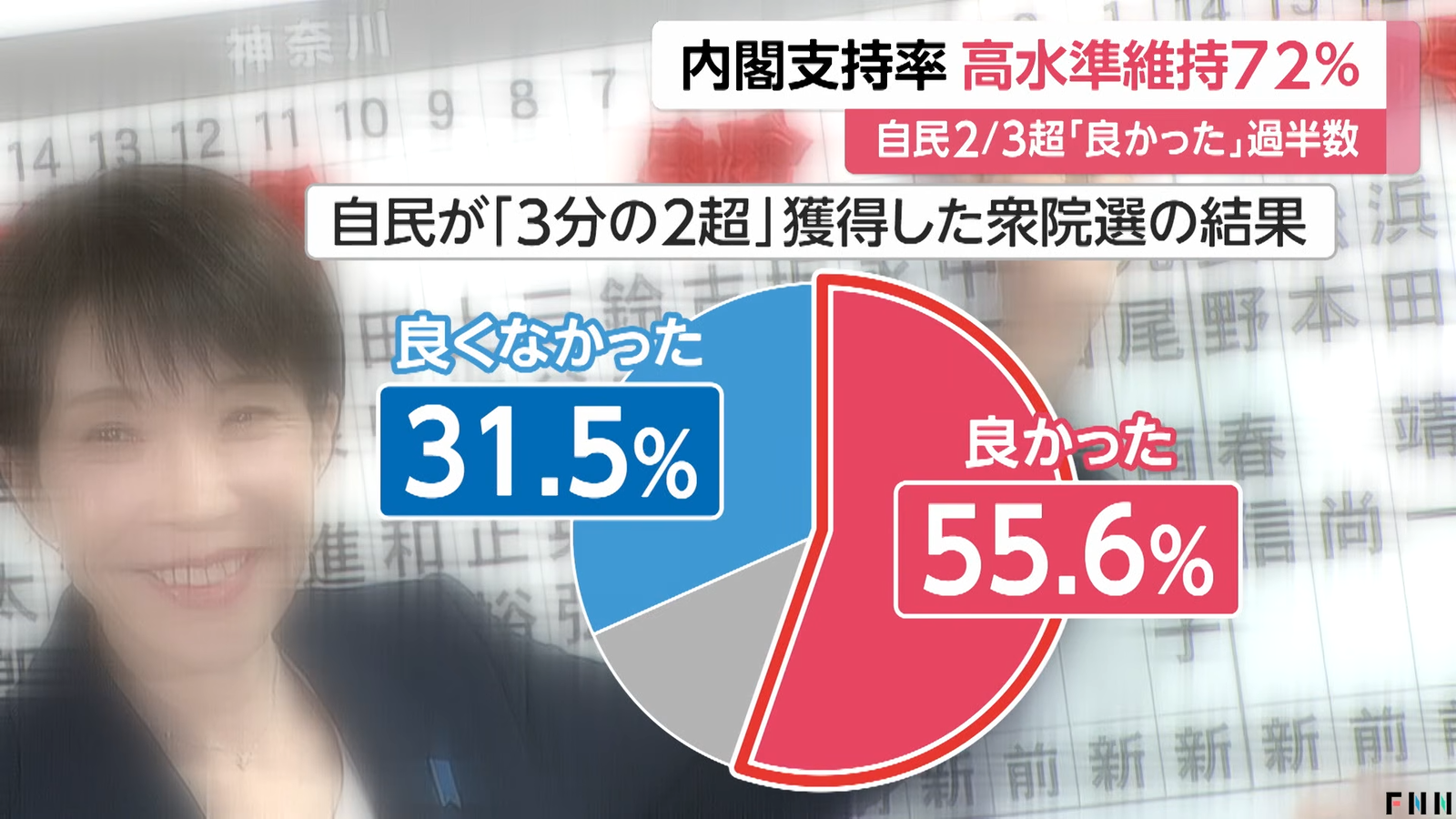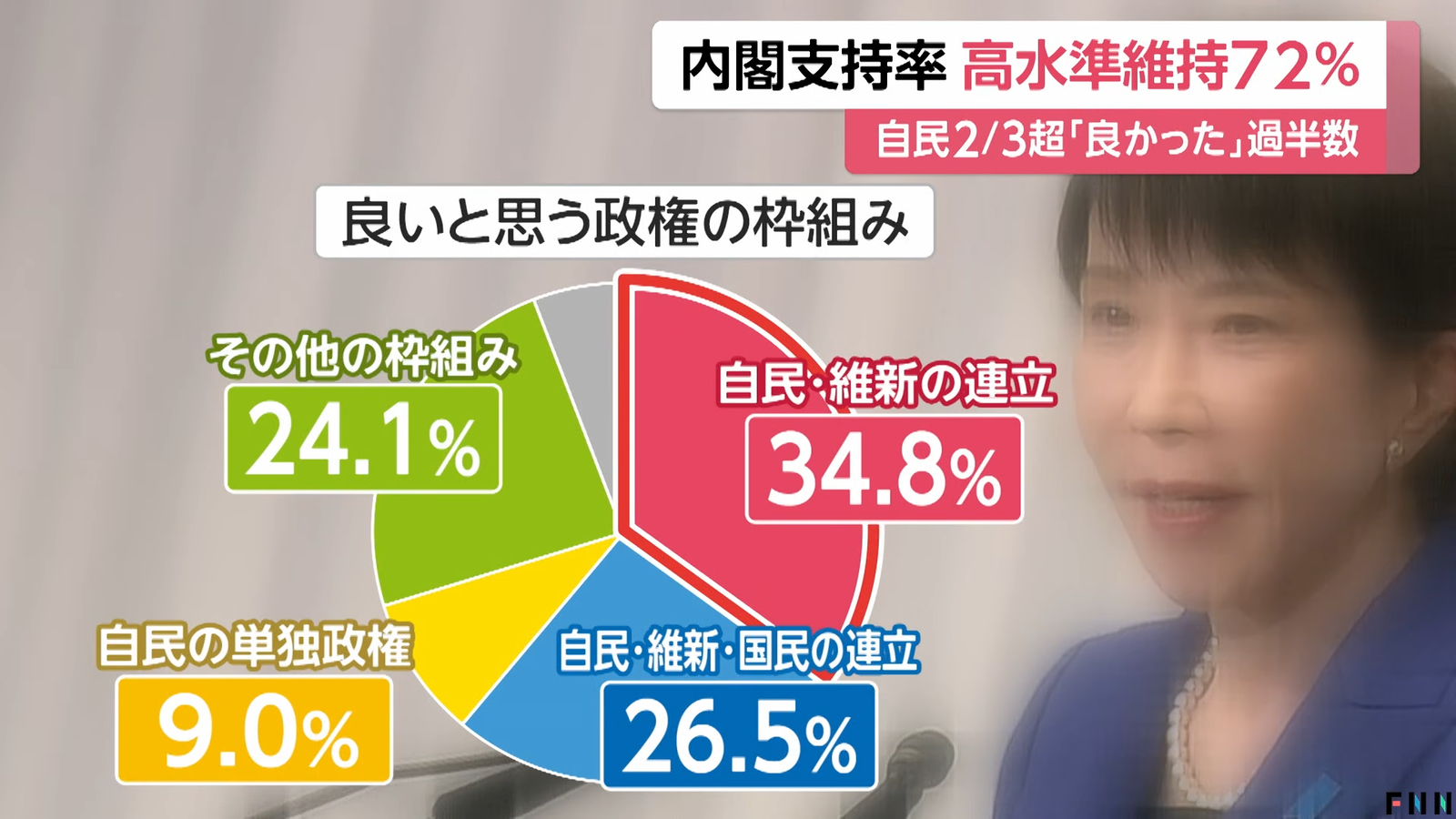 高市内閣支持率72%…維新との連立が「良い」34.8% 中道「立憲と公明に分かれた方がよい」が過半数超え【FNN世論調査】
