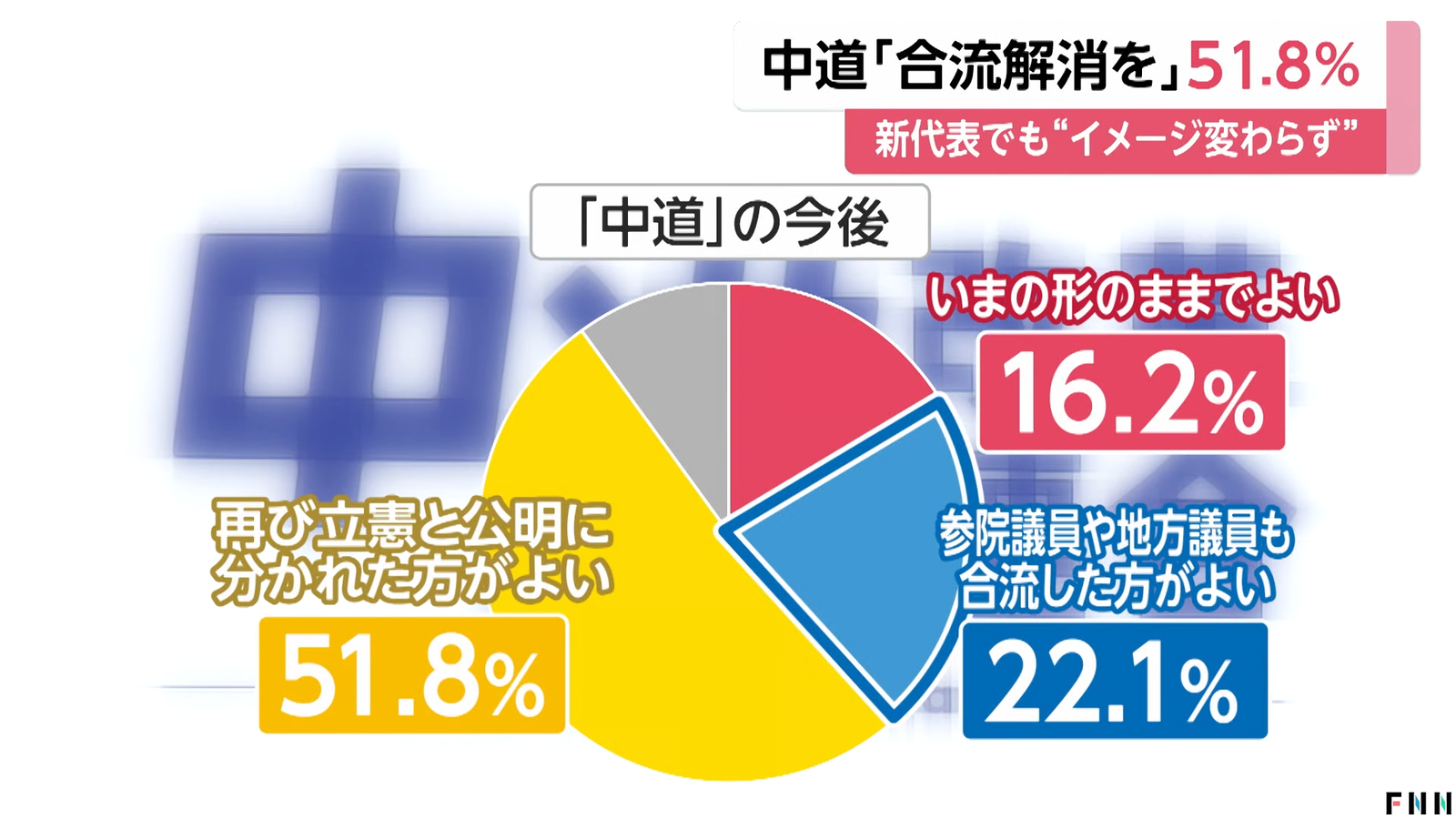 「今の形のままでよい」16.2%、「立憲民主党と公明党の参院議員や地方議員も合流した方がよい」22.1%、「立憲と公明に分かれた方がよい」51.8%