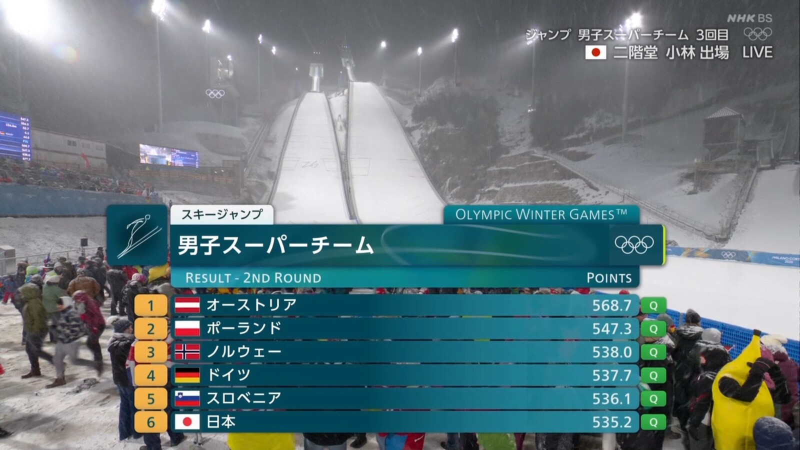 悪夢の大雪 日本がまさかのメダル逸 ジャンプ団体が競技途中打ち切り 2回目終了時点の結果で順位決定で6位に 3回目1人目二階堂の2位浮上大ジャンプが幻に「これが五輪」ぼう然 2位浮上も暗転 会場騒然