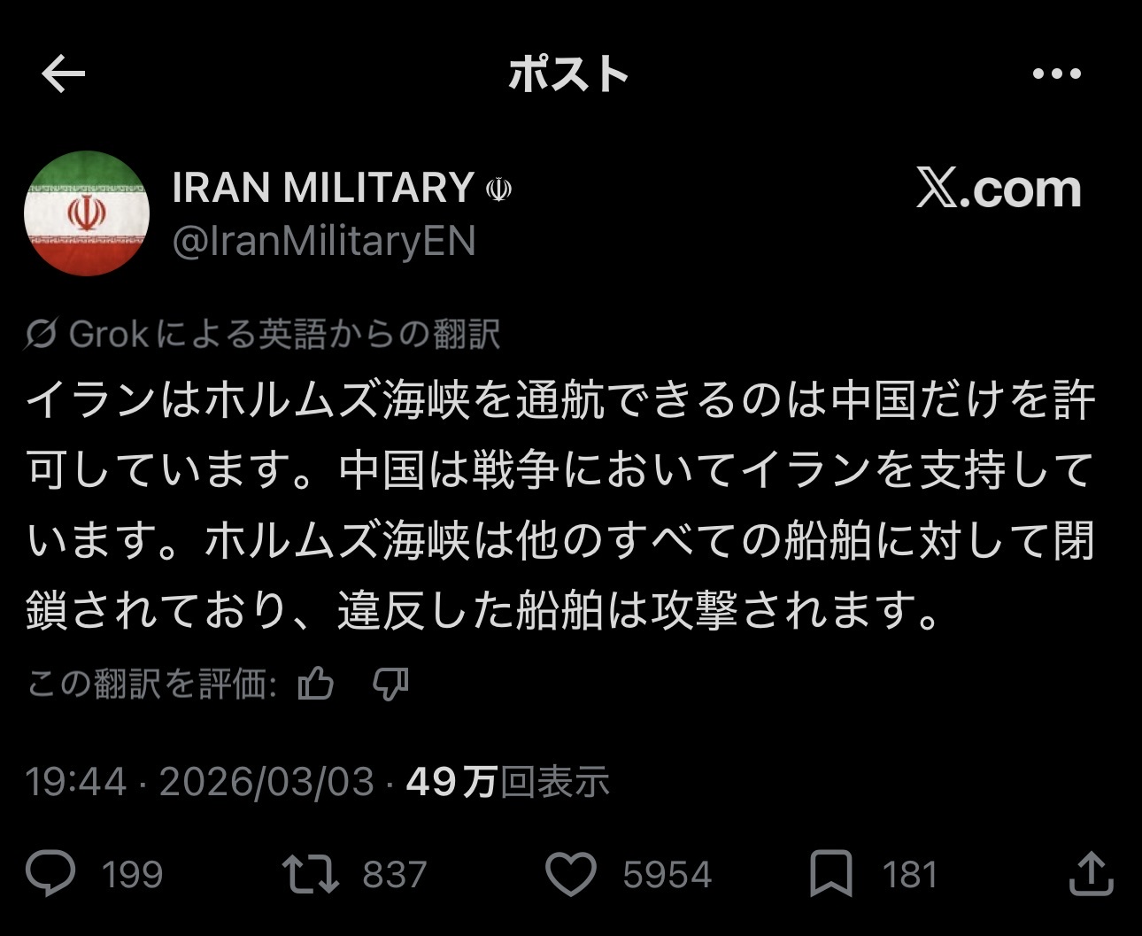 本当にホルムズ海峡の民間船舶を攻撃したら世界の敵になってしまうよ