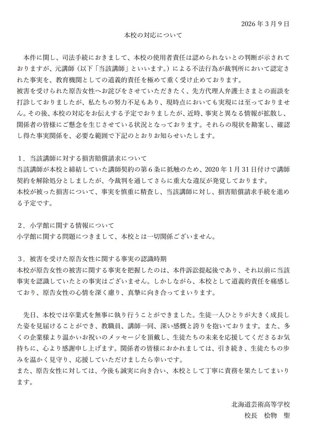北海道芸術高等学校札幌サテライトキャンパスの二回目の声明読んだけど
