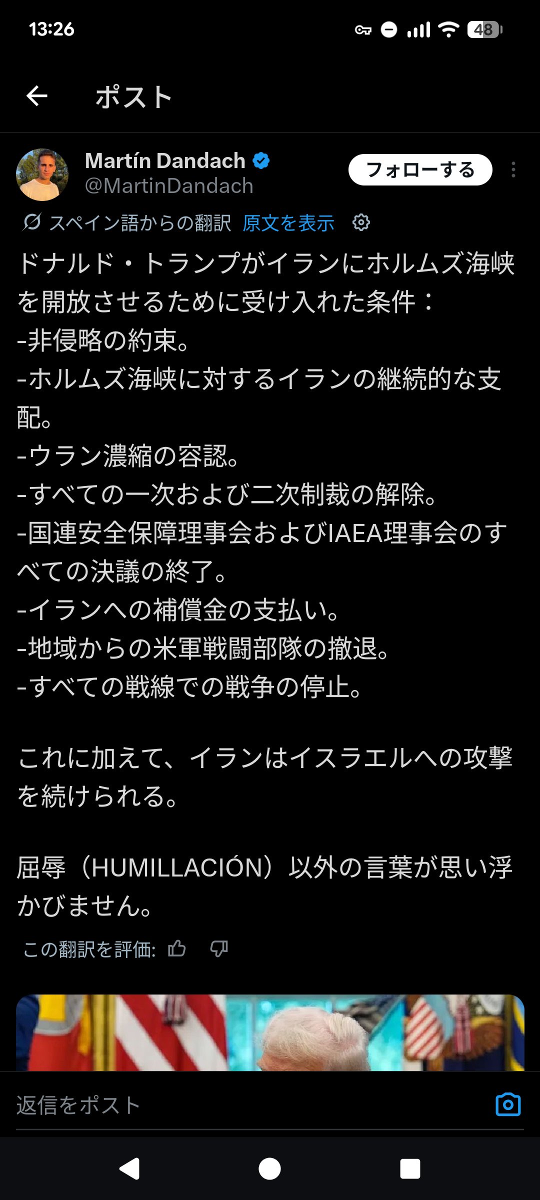 ダメリカの出した15項目の要求とやらをイランは完全拒否。一方ダメリカはイランが出した10項目の要求をほぼ全て受け入れ。