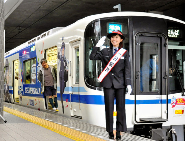 大阪府南部を走る泉北高速鉄道で11日、女性運転士やゆるキャラを描いた記念電車が走り始めた。 終着駅の和泉中央駅(和泉市)の開業20年で企画した。