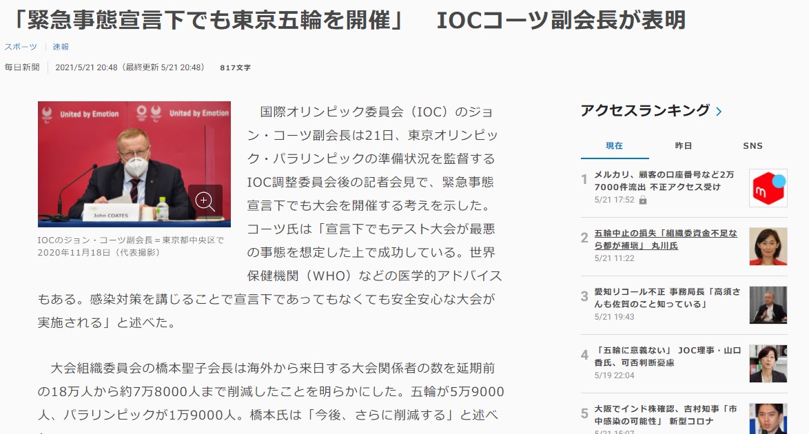 IOC「東京に緊急事態宣言が出てても東京オリンピックはやるぞ」 2021年05月21日 カテゴリ:ニュース Tweet 12Comments 1: 名無し 2021/05/21(金) 20:30:19.09 ID:WNfkPRnfd 「緊急事態宣言下でも東京五輪を開催」 IOCコーツ副会長が表明 https://mainichi.jp/articles/20210521/k00/00m/050/342000c 続きを読む タグ :#病気#スポーツ#イベント 【朗報】東京五輪、有観客で開催か 時給2000円で会場スタッフ募集開始 2021年05月20日 カテゴリ:ニュース Tweet 13Comments 1: 名無し 2021/05/20(木) 01:31:24.66 ID:9xqk1xRW0 2000人以上確保する模様 続きを読む タグ :#スポーツ 三木谷「東京オリンピック開催は自殺行為。日本政府のコロナ対応は10点満点で2点」 2021年05月15日 カテゴリ:ニュース Tweet 19Comments 1: 名無し 2021/05/15(土) 05:43:39.43 ID:vYdzKsz60 五輪開催「自殺行為」と楽天社長 米テレビのインタビューで https://news.yahoo.co.jp/articles/3b780e8154428ef4125405b98e069263a4fc25b8 4: 名無し 2021/05/15(土) 05:44:25.58 ID:25OZXzKtM 言うやん 続きを読む タグ :#スポーツ#イベント#病気 ステージ4でも五輪を開催するのか問われた菅首相 「対策しっかり・・・」を繰り返すだけの機械になる 2021年05月11日 カテゴリ:ニュース Tweet 12Comments 1: 名無し 2021/05/10(月) 18:11:17.39 ID:equ4AmOO0 ステージ4でも五輪? 「対策しっかり…」繰り返す首相 https://digital.asahi.com/articles/ASP5B415YP5BUTFK00J.html 2: 名無し 2021/05/10(月) 18:11:25.51 ID:equ4AmOO0 ヤバすぎやろ 続きを読む タグ :#スポーツ#イベント#病気 ワシントンポスト「日本は東京五輪を中止したほうがいい。IOCは開催国を食い物にする悪癖がある」 2021年05月06日 カテゴリ:ニュース Tweet 7Comments 1: 名無し 2021/05/06(木) 11:21:25.00 ID:rCpYEWvW9 米有力紙、日本に五輪中止促す IOC批判「開催国を食い物」 https://this.kiji.is/762850499815833600?c=39550187727945729 3: 名無し 2021/05/06(木) 11:22:16.65 ID:MPNkxseh0 バカ会長「そんなバッハな!」 続きを読む タグ :#スポーツ#イベント#病気 東京オリンピック、中止・延期すべきが94%wwwwwwwwwww 2021年05月02日 カテゴリ:ニュース Tweet 7Comments 1: 名無し 2021/05/01(土) 01:42:32.94 ID:tIXKyU6m0 「人命より大事な五輪などない」 東京五輪の今夏開催、 「中止・再延期すべき」が94% https://news.yahoo.co.jp/articles/d3fc21392d16a18b1b237b92587174b6df45670d 続きを読む タグ :#スポーツ#イベント 尾身会長「東京五輪を開催するかどうか議論するべき時期にきた」 2021年04月29日 カテゴリ:ニュース Tweet 10Comments 1: 名無し 2021/04/28(水) 20:58:20.56 ID:of5K2baAM 政府分科会の尾身会長 「五輪 議論始めるべき時期」https://news.yahoo.co.jp/articles/367c979dde1732b91c9dec72df87df4dd1fdd3cc 続きを読む タグ :#スポーツ#イベント#病気 日本政府、野球とサッカーのスポーツ賭博合法化を検討 合法化された場合約7兆1000億円強規模のスポーツ賭博市場が誕生 2021年04月28日 カテゴリ:ニュース Tweet 6Comments 1: 名無し 2021/04/28(水) 12:55:22.08 ID:qDNpRZGH0 日本政府、サッカーと野球のスポーツ賭博合法化を検討-報道https://www.bloomberg.co.jp/news/articles/2021-04-28/QS93WYT0AFB701 まじ 続きを読む タグ :#スポーツ 安倍晋三「東京オリンピックの開催は正直厳しいよね」 2021年04月23日 カテゴリ:ニュース Tweet 8Comments 1: 名無し 2021/04/22(木) 16:18:03.52 ID:qR/RRhXQd 菅首相「夏に絶対やる」 五輪強行で 血税1300億円消失 怖い女だから」菅側近が怖れる小池のあの一言 ▼コロナ分科会委員「五輪に医師を割くのは難しい」 ▼二階「中止なら政権飛ぶ」派閥幹部は「もう中止しかない」▼自分のために1年延期安倍「正直 厳しいよね」▼NHKではわからない聖火リレーのブラック現場 http://shukan.bunshun.jp/articles/-/14731 続きを読む タグ :#イベント#スポーツ#病気#経済#政治 |<<前のページ...4647484950次のページ>>|