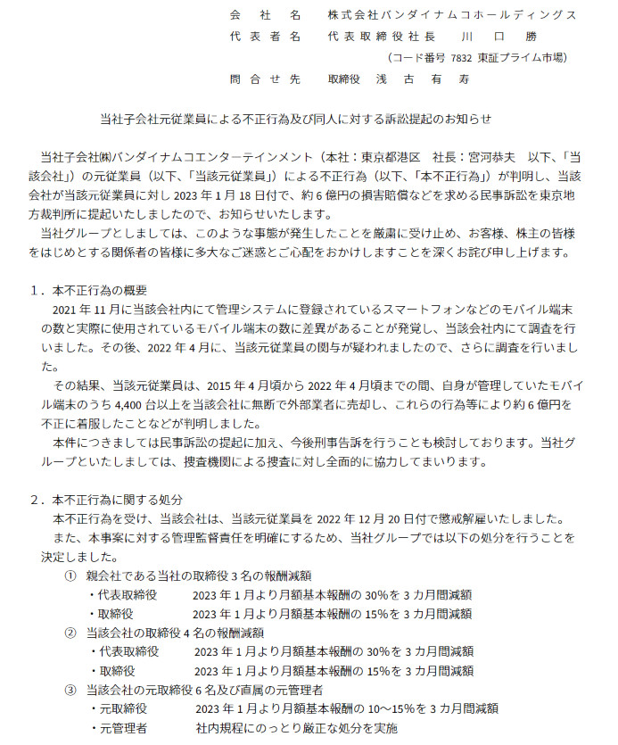 「当社は、本日、株式会社バンダイナムコホールディングス(以下「バンダイナムコ」)との間で戦略的な業務提携契約を締結し、バンダイナムコの既存株主との間で、当該株主が保有するバンダイナムコの株式 1,600 万株を当社が取得することに合意したことを発表しました。詳細は、別添プレスリリースをご参照ください。」