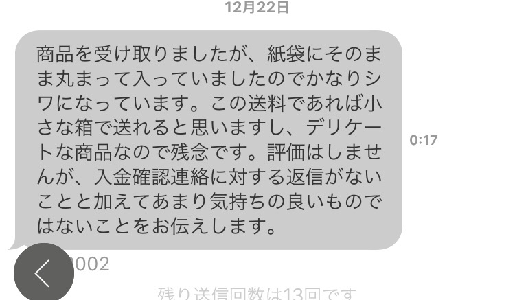 ヤフオクで落札者から文句きてワロタ 2019年12月23日 カテゴリ:VIP Tweet 11Comments 1: 名無し 2019/12/22(日) 00:26:57.229 ID:C4pbApwm0 なんだこいつ 続きを読む タグ :#ヤフオク#トラブル 行政文書を含むHDDを転売していたブロードリンク社員のヤフオク取引履歴がエグい 2019年12月08日 カテゴリ:ニュースPCハード Tweet 7Comments 1: 名無し 2019/12/08(日) 08:09:18.97 ID:0RS5IZrb0 容疑者のHDD出品、入社後急増 落札総額1200万円 https://headlines.yahoo.co.jp/hl?a=20191207-00000037-asahi-soci https://auctions.yahoo.co.jp/jp/show/rating?userID=ajaxdemeer 続きを読む タグ :#犯罪#ヤフオク#HDD iMacにWindow10入れようと思うんだけどヤフオクで300円くらいの買って使ってもいいの? 2019年08月14日 カテゴリ:PCソフト Tweet 10Comments 1: 名無し 2019/08/13(火) 22:13:07.584 ID:V9/RRUu90 OSを買ったら3万くらいするよね。 そこで、ヤフオクで調べてたら300円くらいでwindows10売っている。 これでいいのかな? エクセルとかはついてないんだよねこれ 続きを読む タグ :#Windows#OS#ヤフオク ヤフオク、12月4日~16日まで「PS4本体」や「Switch本体」「シュプリーム」など人気カテゴリの手数料を5%OFF 2018年12月03日 カテゴリ:ニュースSNS&サービス Tweet 0Comments 595: 名無し 2018/12/03(月) 16:08:53.96 ID:MPQdDpFO ヤフオクで12/4~12/16までPS4やSwitchの手数料5%OFFらしい 【告知】人気カテゴリ限定 手数料5%OFFキャンペーン! https://auctions.yahoo.co.jp/topic/notice/special/post_2423/ 続きを読む タグ :#ヤフオク ヤフオクで変な落札者に当たったんやが 2018年10月01日 カテゴリ:VIP Tweet 10Comments 1: 名無し 2018/09/10(月)14:41:49 ID:9Wl 持ち込み割とかで送料が最初に伝えた分より安くなったんやが、安くなった分返金しろ!水増し請求だ!って悪い評価つけられたんやけど相手ケチすぎやん…? 2: 名無し 2018/09/10(月)14:42:41 ID:9Wl ちな、たかだか80円の話やで。 続きを読む タグ :#ヤフオク#トラブル ヤフオク落札残り1分で500円上乗せするマン 2018年08月03日 カテゴリ:VIP Tweet 6Comments 1: 名無し 2018/08/01(水) 22:43:18.34 ID:vcAiatcP0 ワイは現在価格+20000しとるんやぞ 諦めろや 2: 名無し 2018/08/01(水) 22:43:51.11 ID:NprPFe9T0 諦めんで…! 続きを読む タグ :#ヤフオク#ネタ(VIP&なんJ) ヤフオク、月額会員費無料で「オークション出品」可能に(スマホアプリ限定) 2018年03月19日 カテゴリ:ニュースSNS&サービス Tweet 3Comments 1: 名無し 2018/03/19(月) 17:55:01.28 ID:CAP_USER ヤフオク!、アプリ限定で月額会員費無料のフリマ同等 “かんたん”かつ“スピーディー”なオークション出品を開始https://about.yahoo.co.jp/pr/release/2018/03/19a/ 続きを読む タグ :#ヤフオク ヤフオクで落札したら出品者が近所だったwwwwww 2018年02月16日 カテゴリ:VIP Tweet 10Comments 1: 名無し 2018/02/15(木) 10:45:59.023 ID:e4Ls4v1M0 メッセージで直接歩いて取りに行っていいですか?って聞いたらOK貰ったwwww 警戒心なさ過ぎだろこの女wwww 2: 名無し 2018/02/15(木) 10:46:18.823 ID:N4PAwAZV0 男だぞ 続きを読む タグ :#ヤフオク#ネタ(VIP&なんJ) ヤフオクでiPhone Xの箱を12万円で買ってしまった中国人、ガチギレwwwwww 2017年11月30日 カテゴリ:VIP Tweet 9Comments 1: 名無し 2017/11/28(火) 03:15:18.177 ID:bWMMJK4M0 箱1万で買うから残りの11万返してくれって求めてる 8: 名無し 2017/11/28(火) 03:17:40.515 ID:bWMMJK4M0 そりゃ日本人を嫌いになりますわ 続きを読む タグ :#ヤフオク#トラブル |<<前のページ12345次のページ>>|