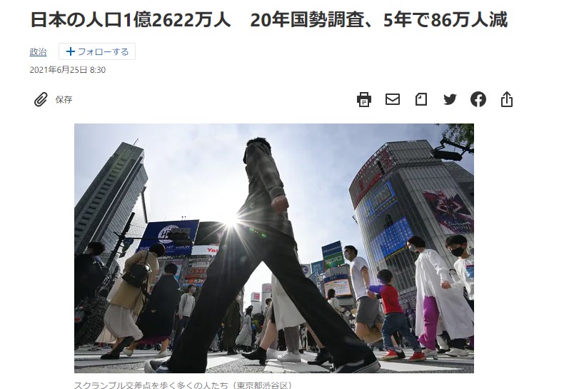 日本の人口1億2622万人 20年国勢調査、5年で86万人減