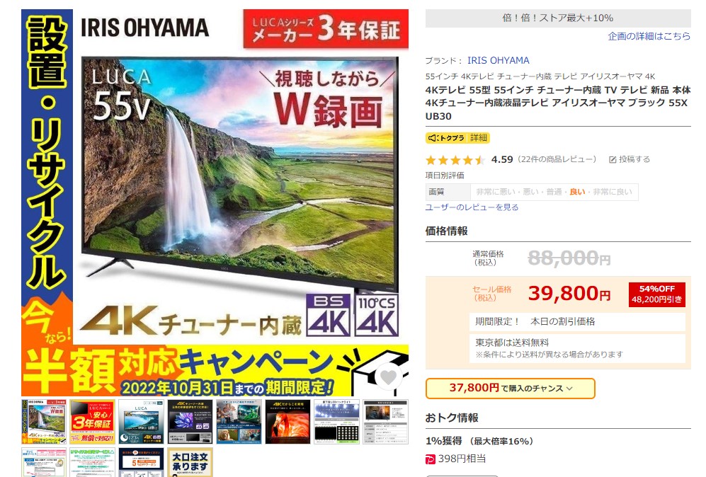Yahooショッピングで55インチの4Kテレビが3万9800円!HDD4TBが5000円!