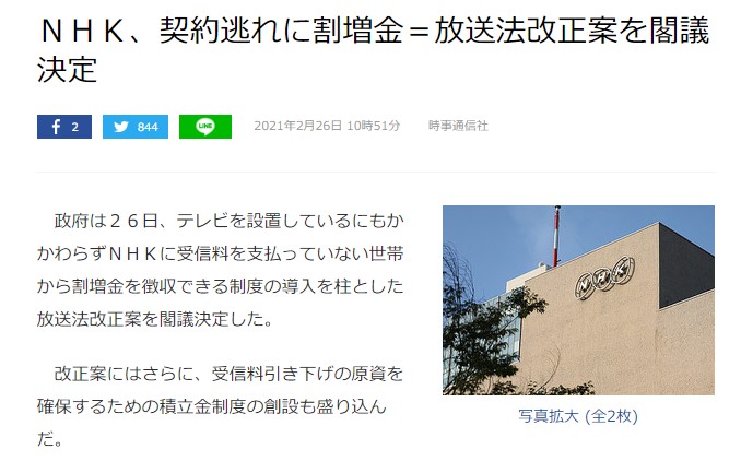 【悲報】日本政府、テレビを設置しているのにNHK受信料を払ってない世帯から割増金を徴収できる制度を導入 2021年02月27日 カテゴリ:ニュース Tweet 27Comments 1: 名無し 2021/02/26(金) 09:44:51.32 ID:ueVe/lsod NHK、契約逃れに割増金=放送法改正案を閣議決定 https://news.livedoor.com/lite/article_detail/19757761/ 2: 名無し 2021/02/26(金) 09:45:13.14 ID:vjkwHUiYd 終わった 続きを読む タグ :#NHK 武田総務大臣「NHKは受信料徴収に郵便局員を使え」 2020年12月20日 カテゴリ:ニュース Tweet 24Comments 1: 名無し 2020/12/19(土) 22:05:00.14 ID:5nZaou67 武田総務相 NHK受信料の徴収 ”日本郵便との連携を提言” TNCの番組で初めて明らかに https://www.tnc.co.jp/news/articles/NID2020121908985 続きを読む タグ :#NHK 武田総務相、NHKにブチギレ「早く値下げしろ 受信料値下げにぐずぐず言うのは常識がない」 2020年12月18日 カテゴリ:ニュース Tweet 28Comments 1: 名無し 2020/12/17(木) 12:11:17.42 ID:fsTC/2Z60 NHKの受信料値下げ消極姿勢は「常識がない」、武田総務相・独占告白https://diamond.jp/articles/-/257476 続きを読む タグ :#NHK#総務省 【悲報】高橋洋一教授「NHKの受信料はせいぜい月200円~300円が妥当」 2020年12月08日 カテゴリ:ニュース Tweet 24Comments 1: 名無し 2020/12/07(月) 11:15:23.58 ID:COUtGq/VM 高橋洋一氏「公共放送に見合うNHK受信料はせいぜい月300円」 https://www.moneypost.jp/731183 続きを読む タグ :#NHK 総務省、NHK受信料を払わない人へのペナルティ金を法制化 2020年11月20日 カテゴリ:ニュース Tweet 35Comments 1: 名無し 2020/11/19(木) 22:22:55.38 ID:6RQJcCrz0 NHK受信料支払い逃れに割増金 https://this.kiji.is/702108379325514849?c=113147194022725109 続きを読む タグ :#NHK 総務省、NHK受信料を全世帯から徴収する仕組みの導入を見送り 時期尚早と判断 2020年11月08日 カテゴリ:ニュース Tweet 12Comments 1: 名無し 2020/11/08(日) 10:04:21.30 ID:bPzty8E+9 NHK受信料、全世帯徴収見送り 23年度までに引き下げ要請―総務省会議 https://www.jiji.com/sp/article?k=2020110700423&g=eco 3: 名無し 2020/11/08(日) 10:05:13.56 ID:3rab4N+e0 当たり前定期 続きを読む タグ :#NHK NHK前田会長「受信料値下げ?番組の質が落ちるぞ」 2020年10月22日 カテゴリ:ニュース Tweet 35Comments 1: 名無し 2020/10/21(水) 18:15:18.47 ID:c4sIO+Tjp BE:771746795-2BP(1000) NHK前田会長が受信料値下げに否定的見解「ありきでは番組の質が落ちる」 https://news.livedoor.com/lite/article_detail/19092730/ 続きを読む タグ :#NHK |<<前のページ...23456...次のページ>>|