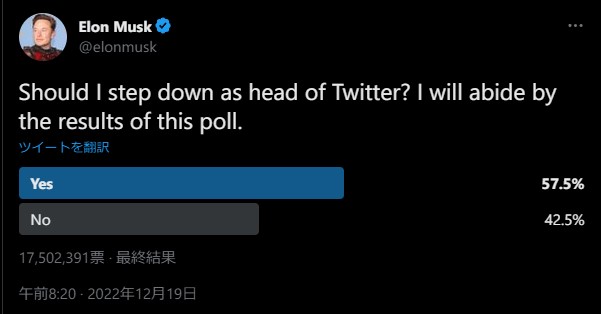 イーロン・マスクの「TwitterCEO辞任すべきか」投票、賛成多数で終了
