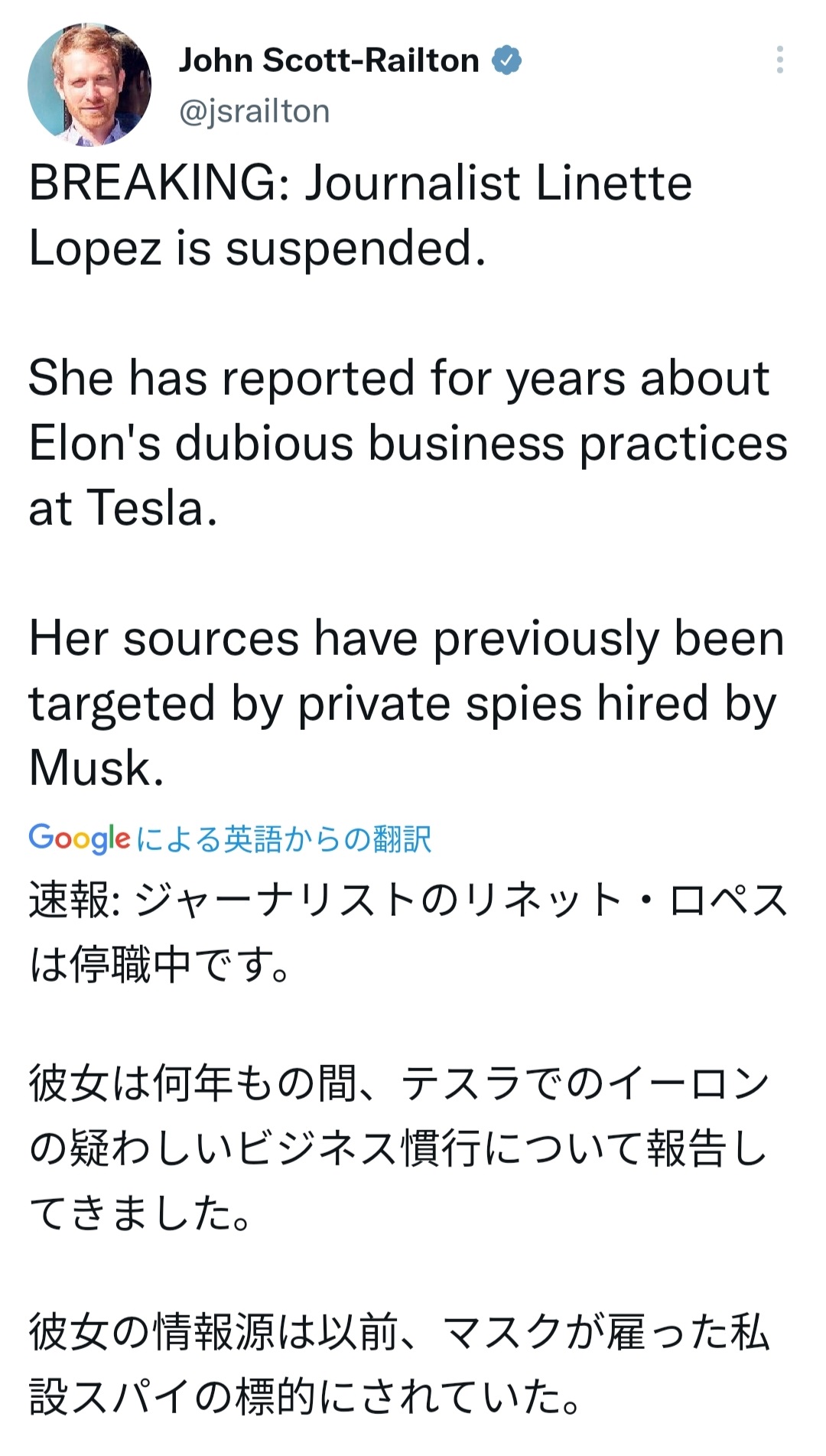 Musk Suspends Reporter Who Has Investigated Him for Years https://www.thedailybeast.com/elon-musk-suspends-insiders-linette-lopez-another-reporter-who-pissed-him-off