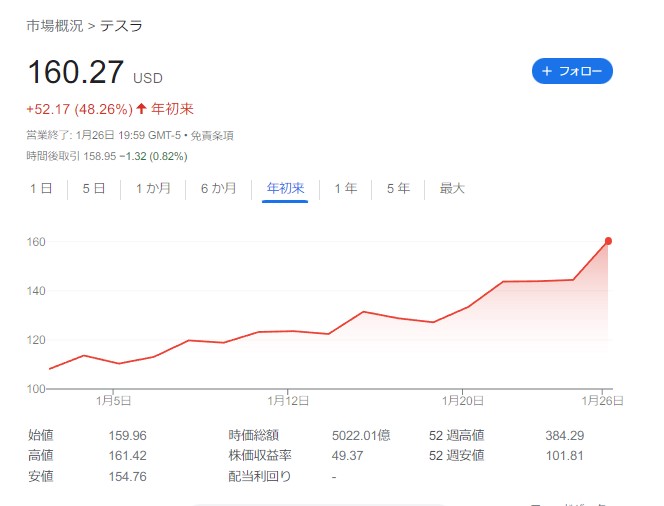 【朗報】テスラ株、今年のお年玉で買っていれば1.5倍に