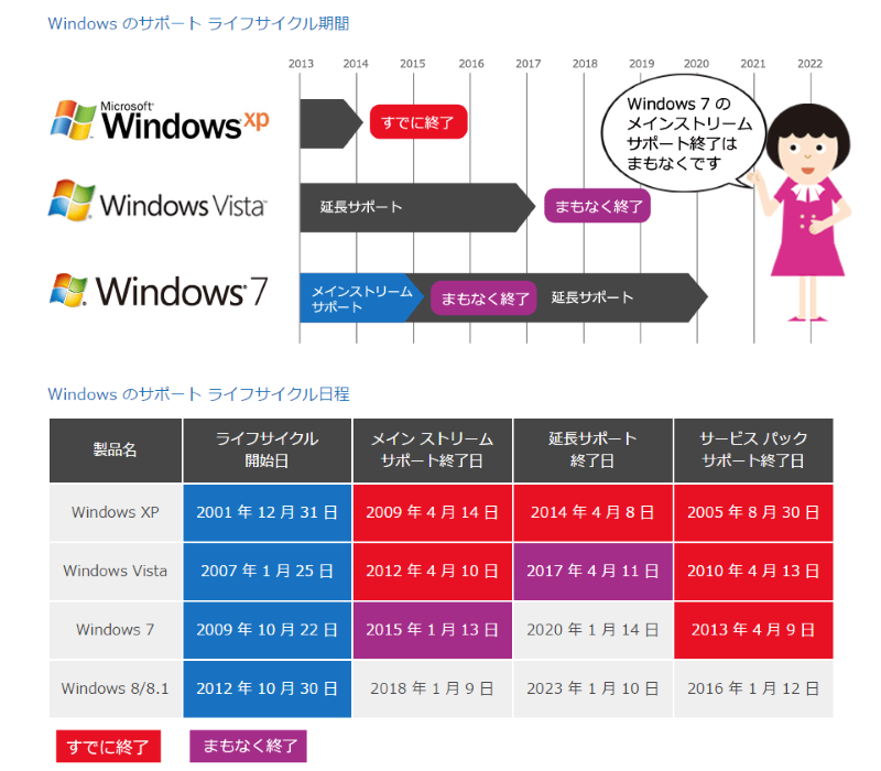 Windows7の延長サポート期間の終了は2020年1月14日で、これ以降はセキュリティ更新プログラムの提供を含むすべてのサポートが終了する。また、Windows Vistaについても、延長サポート期間の終了が2017年4月11日に迫っている。