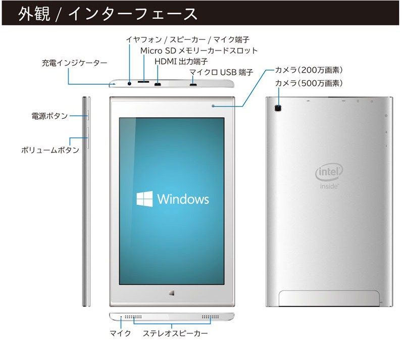 主な仕様は、CPUにAtom Z3735F(1.33GHz、ビデオ機能内蔵)、メモリ2GB、32GB eMMC、WUXGA表示/10点マルチタッチ対応8.9型ワイド液晶ディスプレイ、OSにWindows 8.1 with Bingを搭載する。